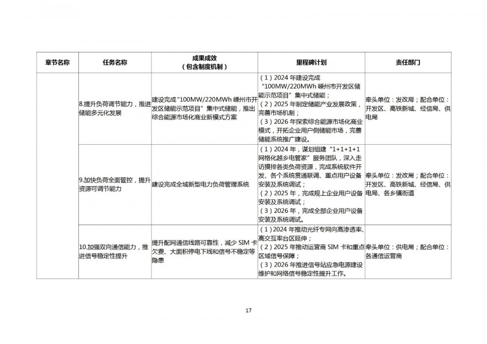 建立负荷管控中心,开发新型电力负荷管理系统,接入全域分布式光伏、集中式储能、火力发电、水电资源、园区微网、用户侧分布式储能、空调负荷、用户可调节负荷等资源,实现源、网、荷、储四侧“可观可测、可控可调”,在负荷缺口期间策略生成、策略执行、负荷响应、实时负荷曲线生成、调节结果展示等功能,实现区域能量管控,优化资源可调节的能力。2024年,谋划组建“1+1+1+1网格化越乡电管家”服务团队,深入走访摸排各类负荷资源,完成系统软件开发、贯通联调、重点用户设备安装调试。2025年,完成规上企业用户设备安装调试。2026年,完成全部企业用户设备安装调试。(牵头单位:发改局;配合单位:开发区、高铁新城、经信局、供电局、各乡镇街道)