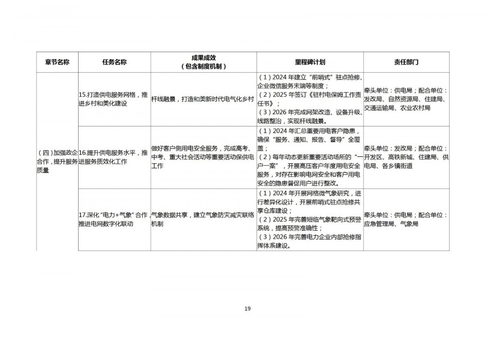 加强政企合作,合力打造和美新时代电气化乡村。运用数字化技术,采用网架改造、设备升级、线路整治等方式,实现杆线融景,最大限度保留乡村和美环境。持续延伸服务触角,采用“前哨式”驻点抢修、台区经理“一岗制”、企业微信末端服务等先进管理举措,以实际问题为导向,主动上门解决农村用户各类用电问题。深入开展志愿服务,以“驻村电保姆+红船共产党员服务队”形式,为农村孤寡老人开展表后用电安全隐患排查等志愿服务活动。(牵头单位:供电局;配合单位:发改局、自然资源局、住建局、交通运输局、农业农村局)