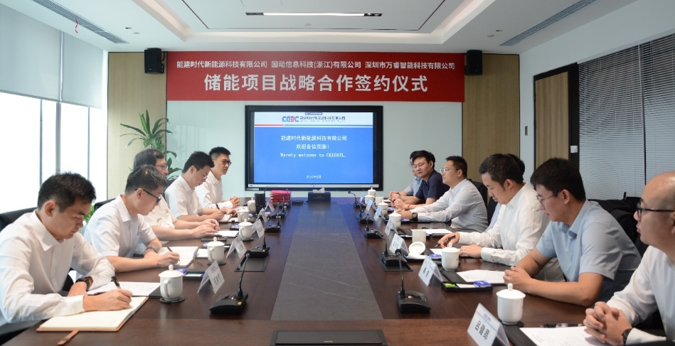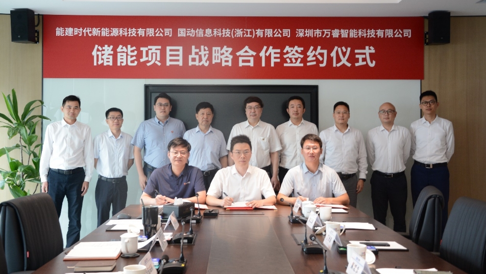 8月13日,能建时代新能源总经理欧阳成新与国动网络通信集团股份有限公司高级副总裁黄旭永、深圳市万睿智能科技有限公司总经理夏明超、万物云空间科技服务股份有限公司杭州代表处总经理丁光强举行会谈。各方围绕新基建+新能源、工商业储能等新型储能技术应用及市场发展趋势进行了深入交流,并签署储能项目战略合作协议。