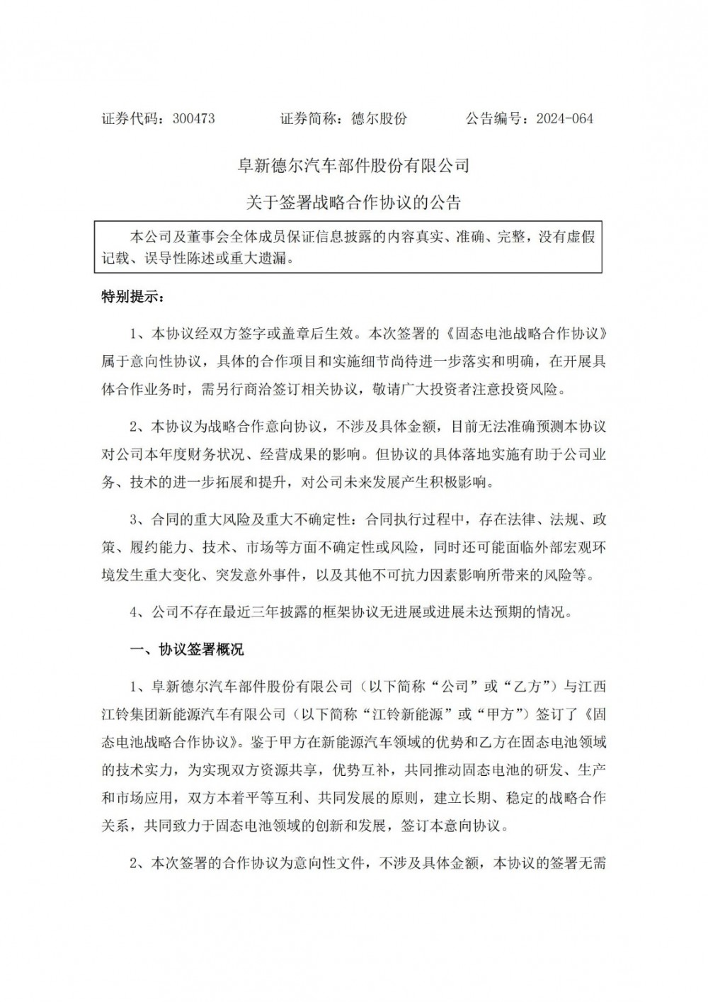 近日,德尔股份发布公告称,公司与江西江铃集团新能源汽车有限公司(以下简称“江铃新能源”)签订了《固态电池战略合作协议》。鉴于甲方在新能源汽车领域的优势和乙方在固态电池领域的技术实力,为实现双方资源共享,优势互补,共同推动固态电池的研发、生产和市场应用,双方本着平等互利、共同发展的原则,建立长期、稳定的战略合作关系,共同致力于固态电池领域的创新和发展,签订本意向协议。