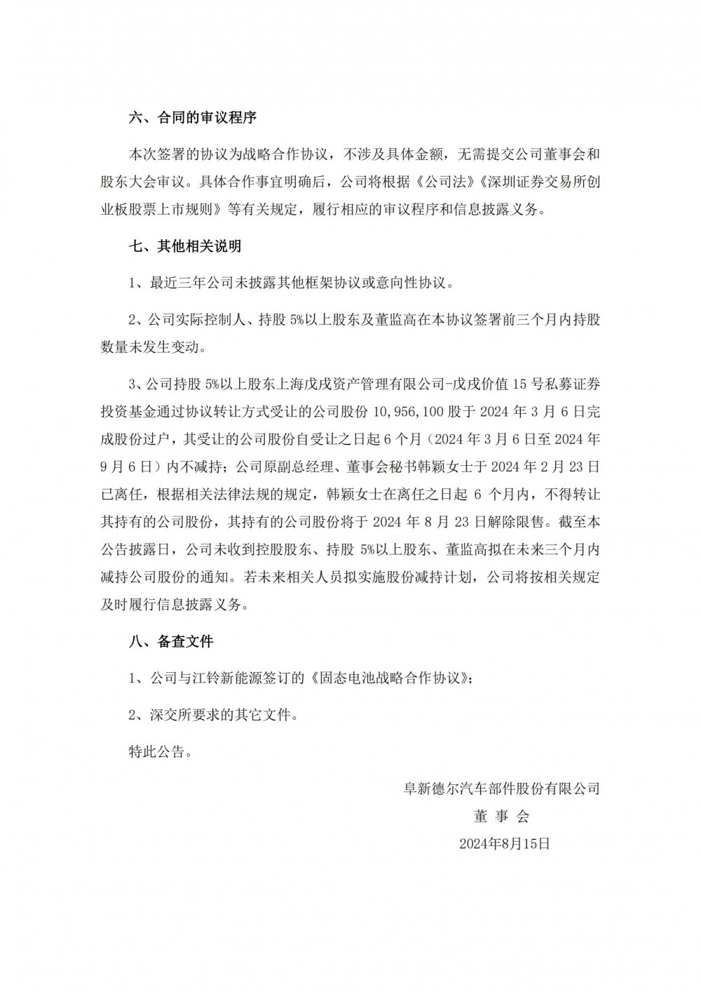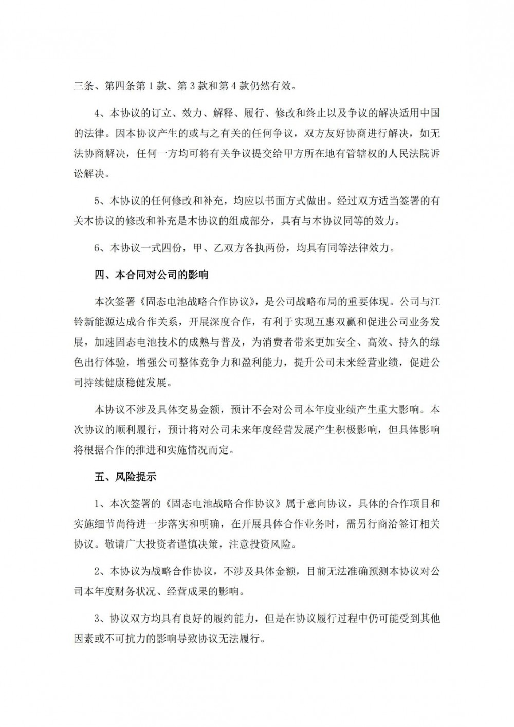 德尔股份表示,本次签署《固态电池战略合作协议》,是公司战略布局的重要体现。公司与江铃新能源达成合作关系,开展深度合作,有利于实现互惠双赢和促进公司业务发展,加速固态电池技术的成熟与普及,为消费者带来更加安全、高效、持久的绿色出行体验,增强公司整体竞争力和盈利能力,提升公司未来经营业绩,促进公司持续健康稳健发展。