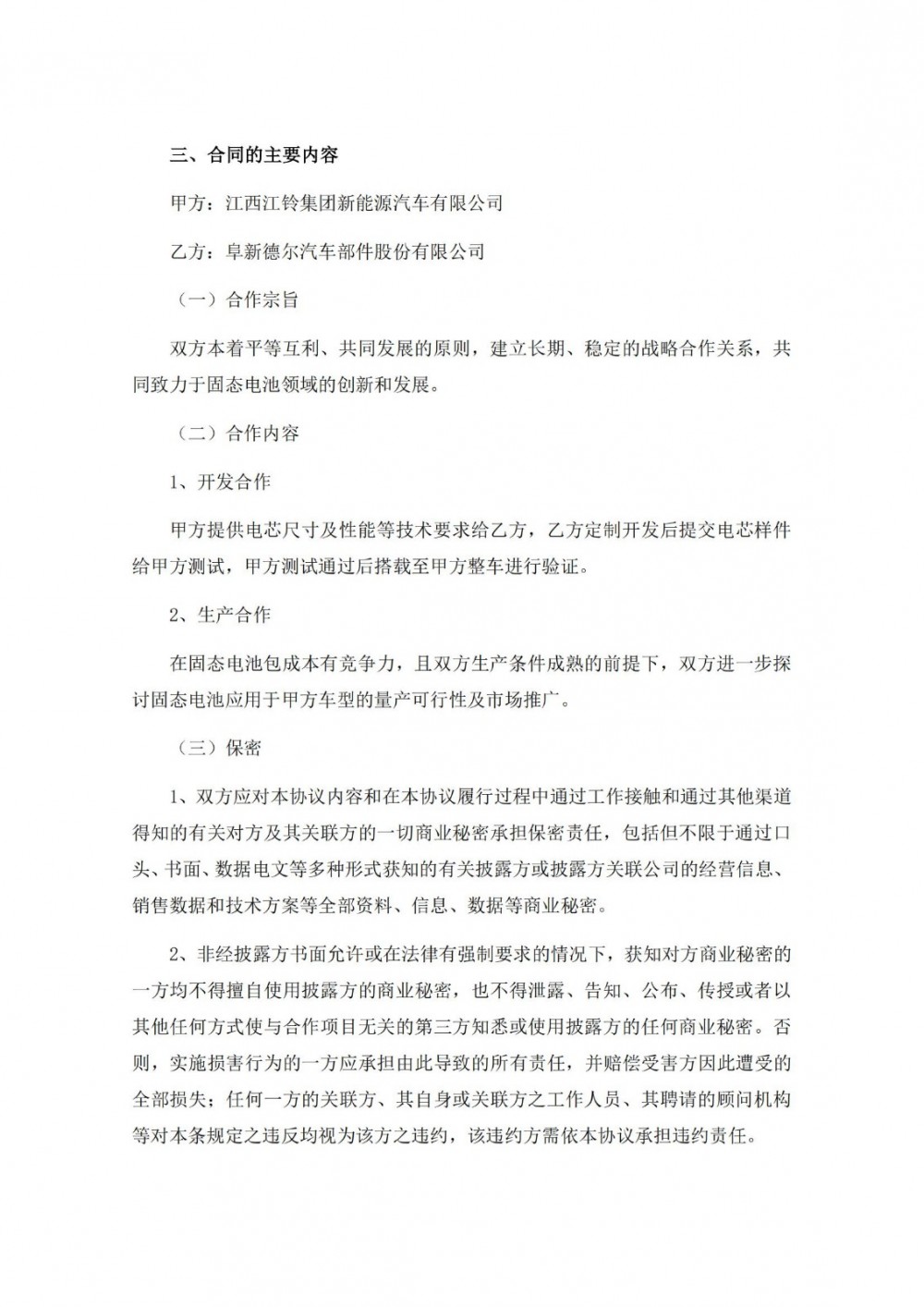 在固态电池包成本有竞争力,且双方生产条件成熟的前提下,双方进一步探讨固态电池应用于德尔股份车型的量产可行性及市场推广。