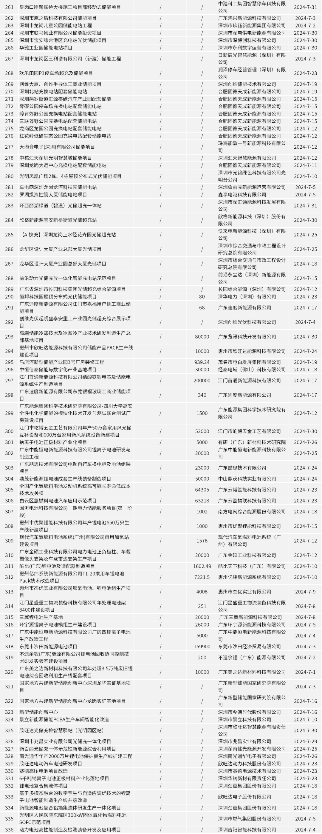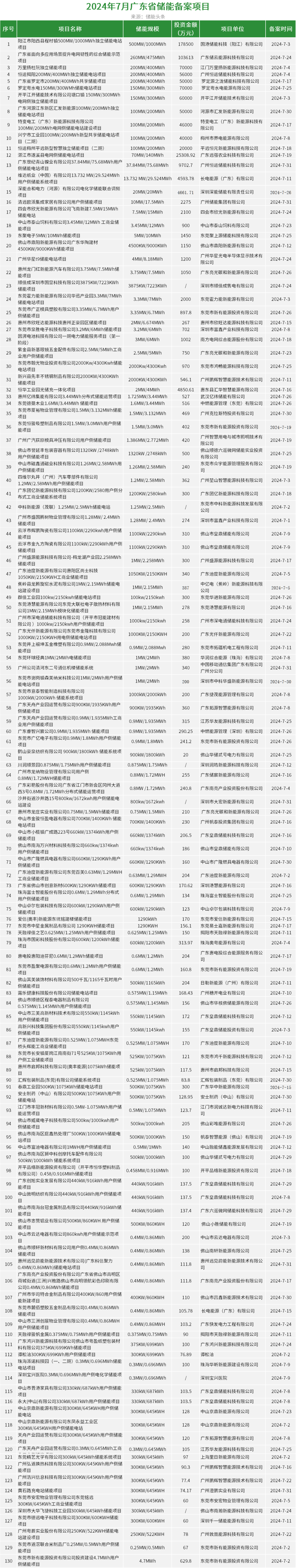 据公开数据不完全统计,2024年7月广东(含深圳)完成储能项目备案336个,投资金额169.88亿元,备案储能规模2348.7MW/4651.1MWh。