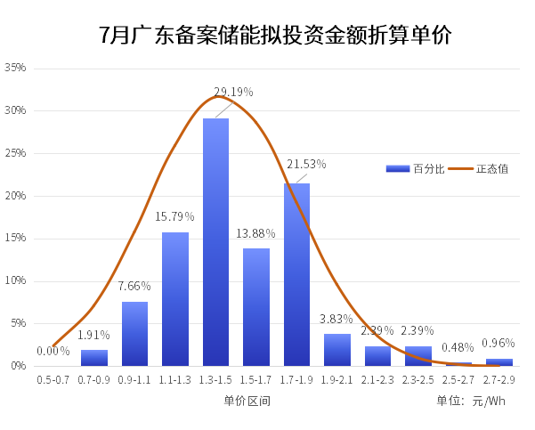 从投资成本单价来看,如下图所示,广东储能项目按投资折算单价多数处在1.1元/Wh~2元/Wh的范围内,单价在1.5元/Wh附近的占比最多。