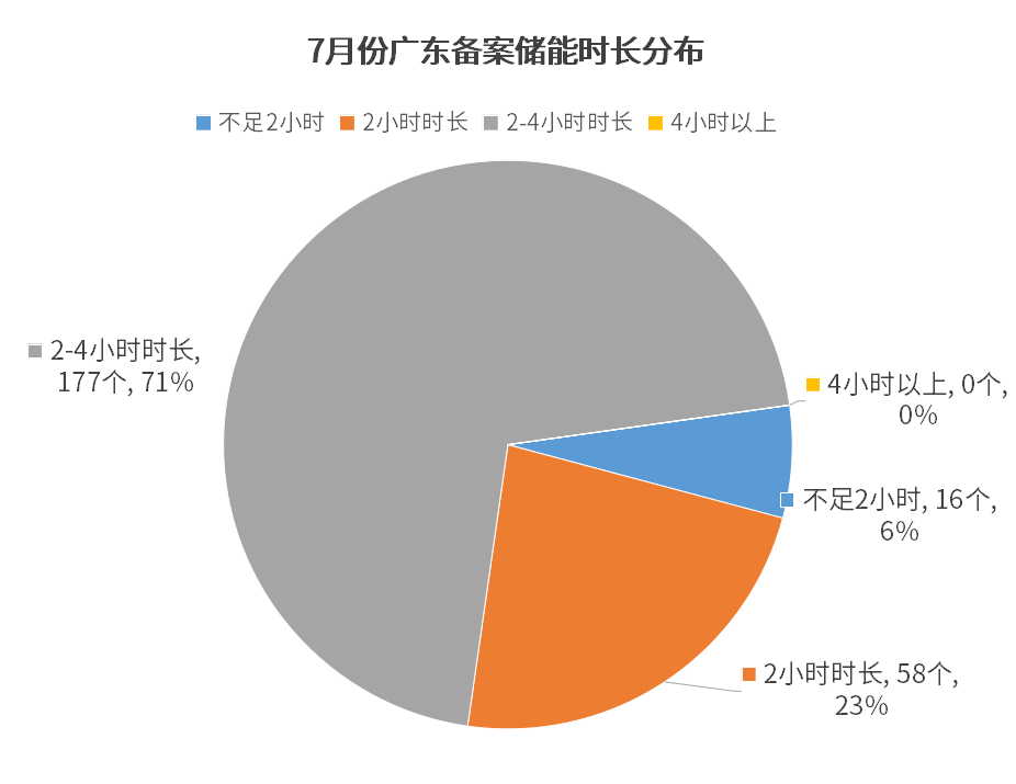 从备案项目的储能时长来看,据储能备案项目公开的信息得出,储能时长主要集中在2-4小时为主,其中2至4小时的储能项目有177个,占71%;时长2小时的储能项目有58个,占23%;时长在1至2小时的储能项目有16,占6%;没有4小时以上的长时储能项目备案。