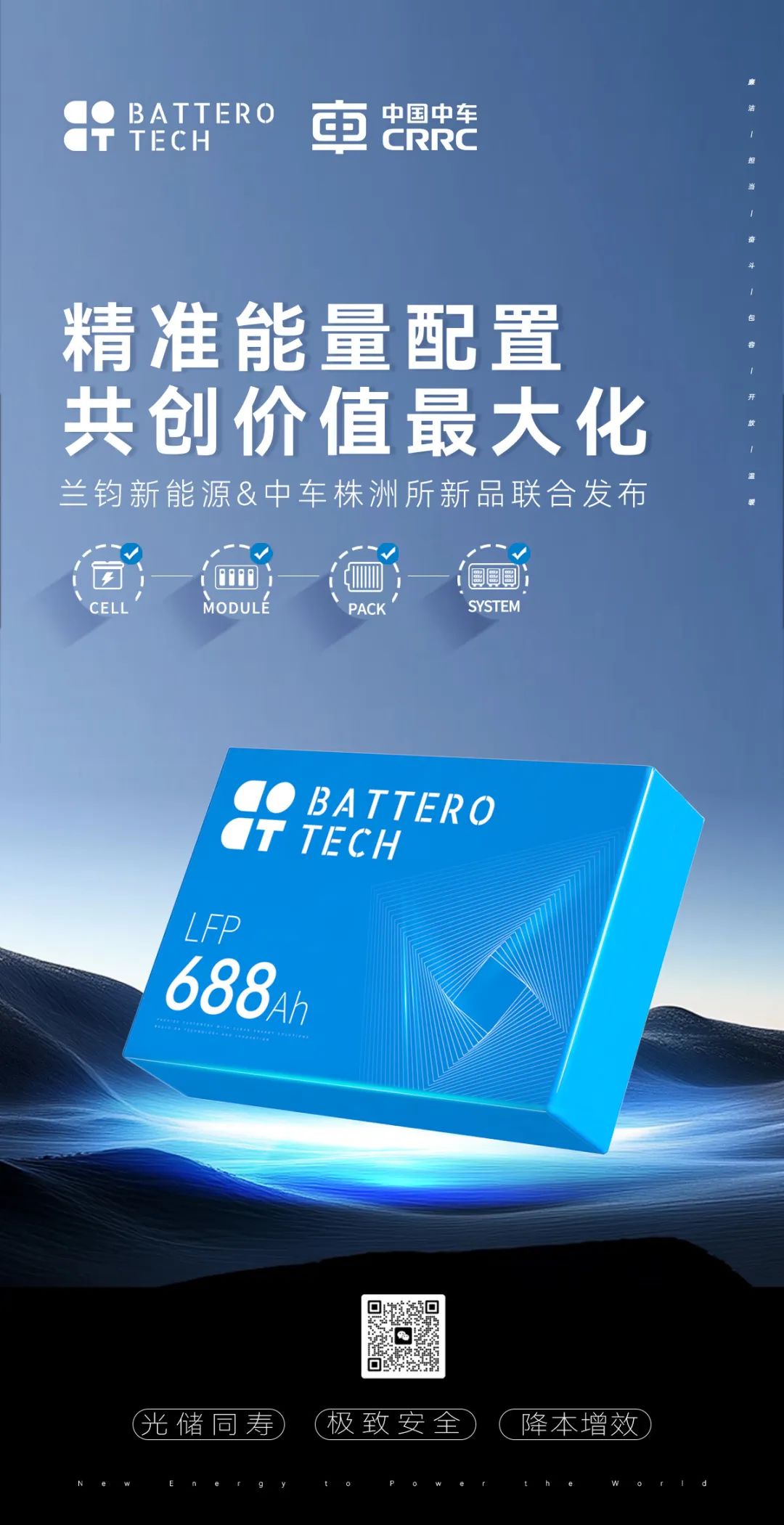 自2021年底,兰钧新能源推出280Ah储能专用电芯以来,公司始终紧跟储能市场的发展步伐。2023年,公司发布了基于280Ah同尺寸的314Ah储能专用电芯,并已实现批量稳定交付。为满足储能市场新一代更高产品力的市场生态要求,兰钧新能源与中车株洲所联合开发了新一代688Ah储能专用大电芯。