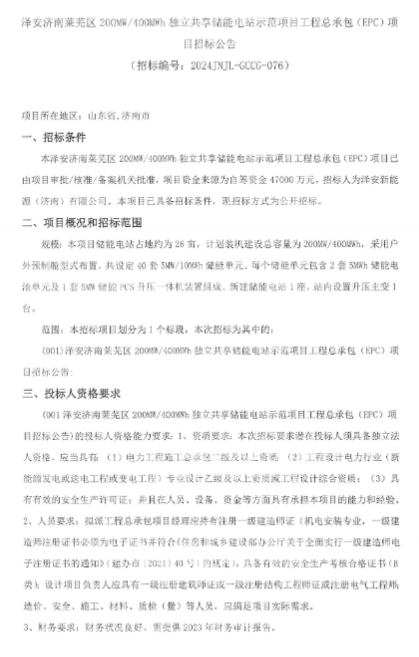 9月3日,泽安新能源(济南)有限公司发布泽安济南莱芜区200MW/400MWh独立共享储能电站示范项目工程总承包(EPC)项目招标公告,项目位于山东省济南市,项目资金来源为自筹资金47000万元,折合单价1.175元/Wh。