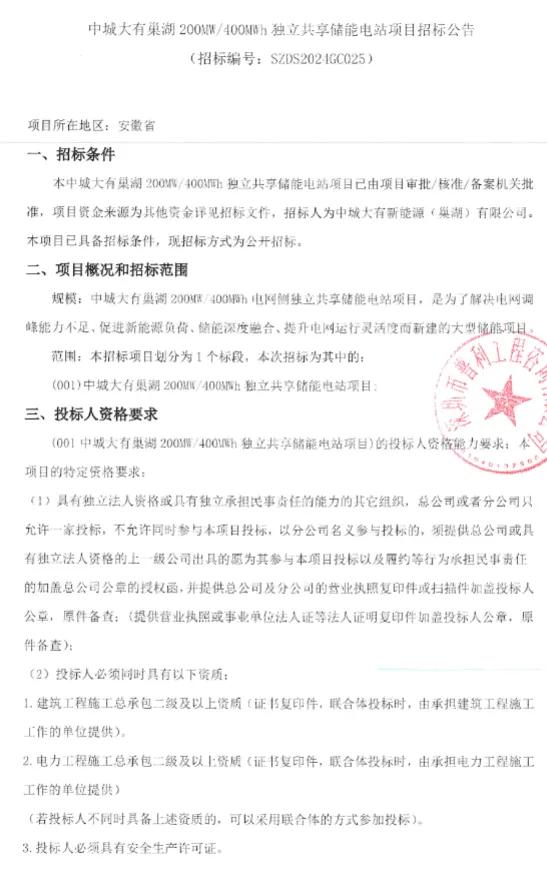 北极星储能网获悉,9月5日,中城大有巢湖200MW/400MWh独立共享储能电站项目招标公告发布。文件显示,项目所在地为安徽巢湖市,招标人为中城大有新能源(巢湖)有限公司。