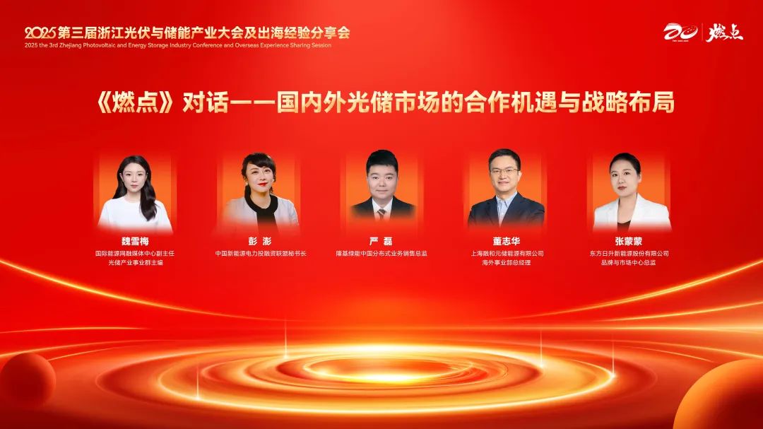 在《燃点》对话之中,融媒体中心副主任、光储产业事业群主编魏雪梅,中国新能源电力投融资联盟秘书长彭澎,隆基绿能分布式销售总监严磊,上海融和元储能源有限公司海外事业部总经理董志华,东方日升新能源股份有限公司品牌与市场中心总监张蒙蒙展开对话。他们对国内外光储市场的合作机遇与战略布局进行了充分的探讨与论述。