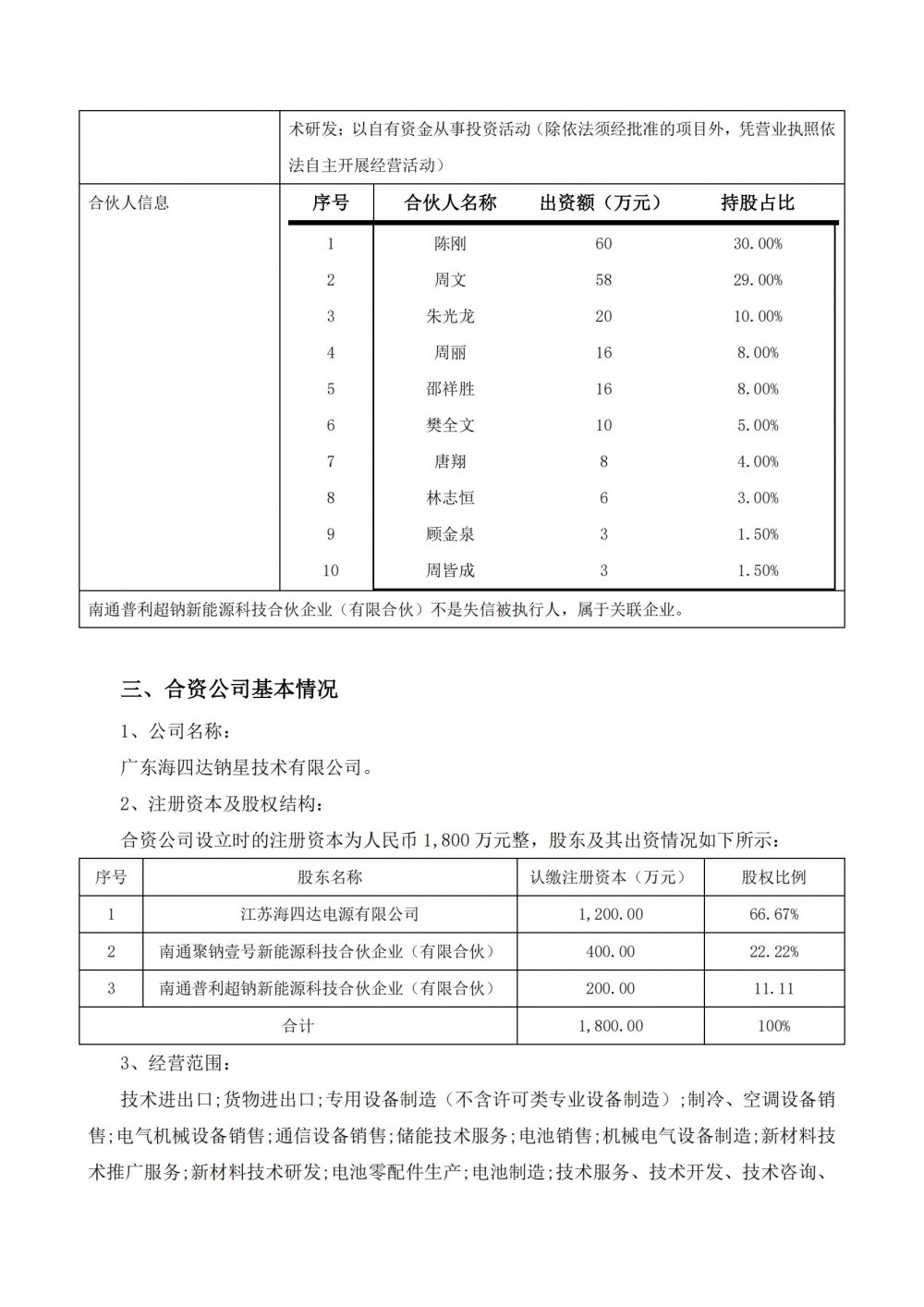 占注册资本的66.67%;南通聚钠壹号新能源科技合伙企业(有限合伙)出资400万元,占注册资本的22.22%;南通普利超钠新能源科技合伙企业(有限合伙)出资200万元,占注册资本的11.11%。