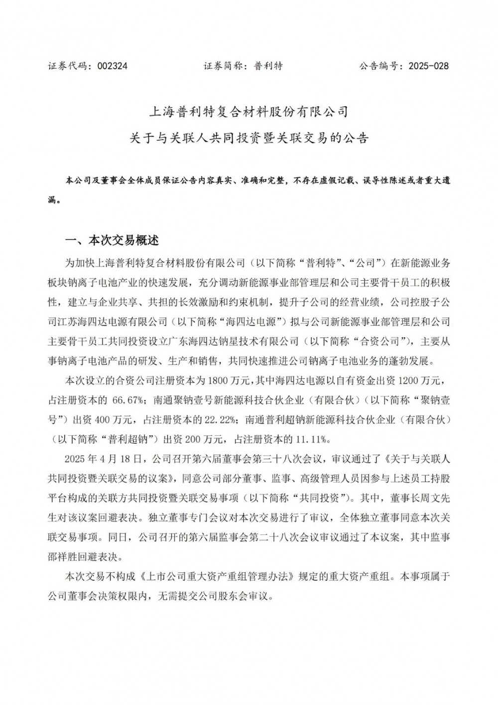 4月18日,普利特发布公告称,为加快公司在新能源业务板块钠离子电池产业的快速发展,充分调动新能源事业部管理层和公司主要骨干员工的积极性,建立与企业共享、共担的长效激励和约束机制,提升子公司的经营业绩,公司控股子公司江苏海四达电源有限公司拟与公司新能源事业部管理层和公司主要骨干员工共同投资设立广东海四达钠星技术有限公司,主要从事钠离子电池产品的研发、生产和销售,共同快速推进公司钠离子电池业务的蓬勃发展。