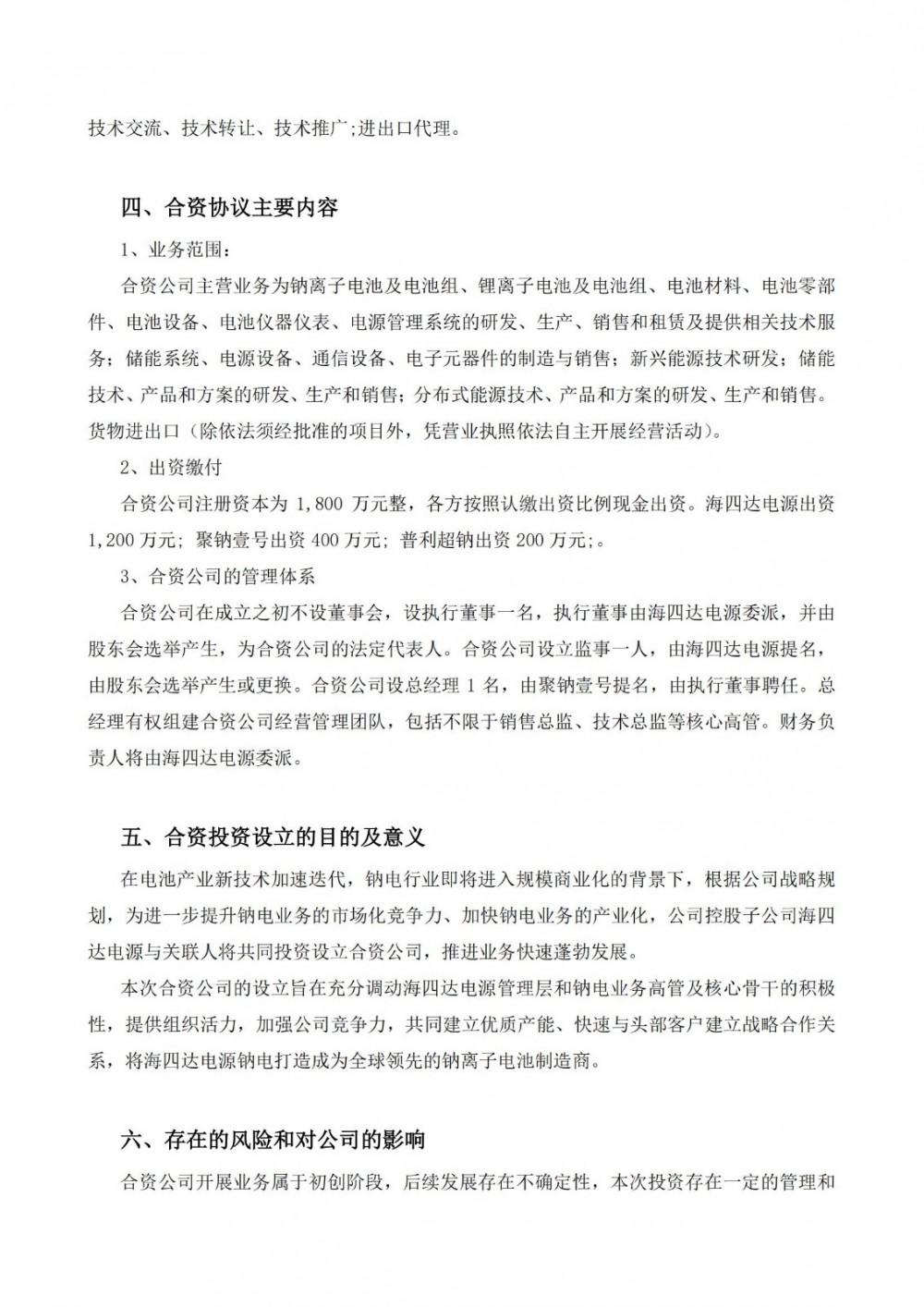 本次合资公司的设立旨在充分调动海四达电源管理层和钠电业务高管及核心骨干的积极性,提供组织活力,加强公司竞争力,共同建立优质产能、快速与头部客户建立战略合作关系,将海四达电源钠电打造成为全球领先的钠离子电池制造商。