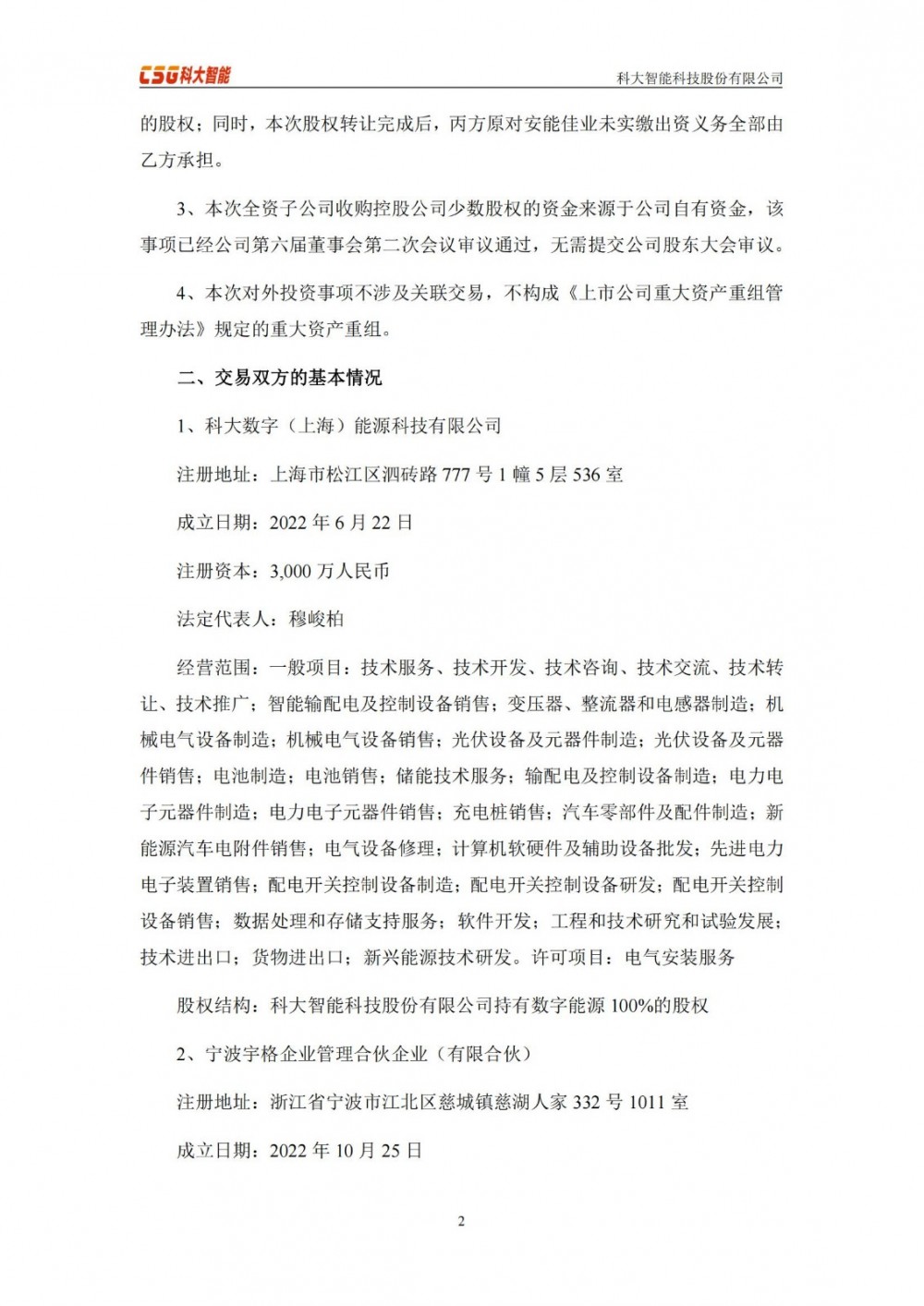 科大智能发布公告称,近日,各方共同签订《科大智能科技股份有限公司及其子公司科大数字(上海)能源科技有限公司与宁波宇格企业管理合伙企业(有限合伙)、宁波博勒企业管理合伙企业(有限合伙)投资合作协议之终止协议》。由公司全资子公司科大数字(上海)能源科技有限公司以140万元和105万元的价格分别收购宁波宇格和宁波博勒在合资公司安能佳业的股权。