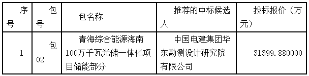 4月17日,青海综合能源海南100万千瓦光储一体化项目(储能部分)推荐的中标候选人公示。涉及储能部分规模200MW/400MWh。公示显示,中国电建集团华东勘测设计研究院有限公司以投标报价31399.88万元预中标。