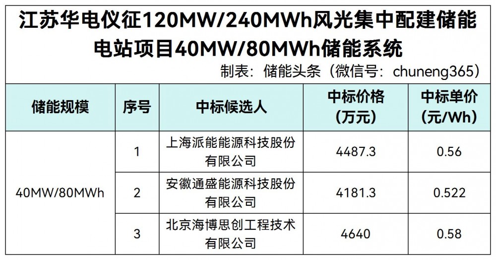 第一中标候选人为上海派能能源科技股份有限公司,投标报价4487.3万元,折合单价0.56元/Wh;第二中标候选人为安徽通盛能源科技股份有限公司,投标报价4181.3万元,折合单价0.522元/Wh;第三中标候选人为北京海博思创工程技术有限公司,投标报价4640万元,折合单价0.58元/Wh。