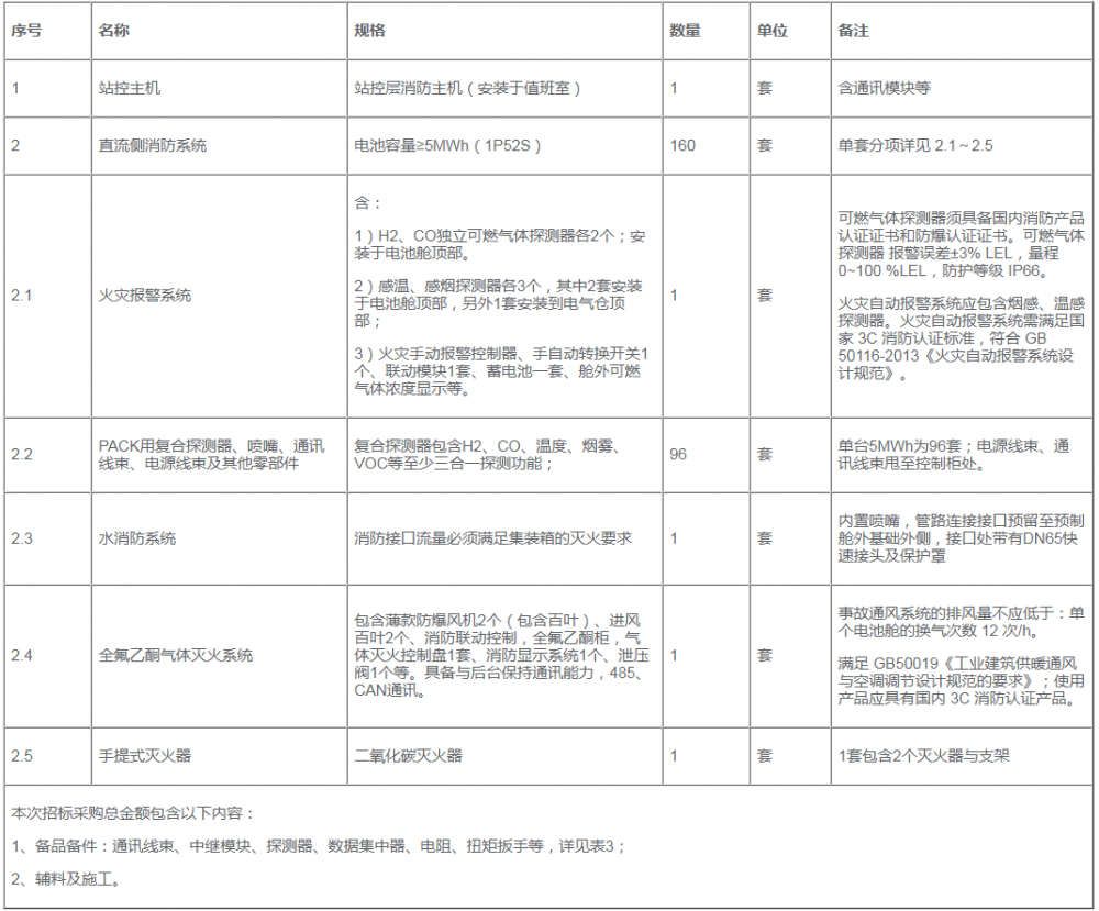 2.2招标范围:800MWh储能预制舱消防系统所需设备的供货及安装、接线、试验及调试,包括前端探测设备、火灾报警控制主机、灭火装置及管路、消防排烟装置等,详见表1。