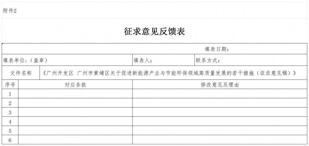 为进一步优化我区法治化营商环境,提高政策精准度,加快培育新质生产力,构建广州市“12218”和黄埔区“12136”现代化产业体系,打造新能源产业与节能环保领域发展高地,我局研究起草了《广州开发区 广州市黄埔区关于促进新能源产业与节能环保领域高质量发展的若干措施(征求意见稿)》(附件1),现依据《广州市黄埔区广州开发区行政规范性文件管理办法》(穗埔府〔2021〕1号)有关规定,公开向社会征求意见,征求意见时间为4月2日至4月14日。如有意见请填写《征求意见反馈表》(附件2)并发送至邮箱fzc310@163.com,联系人:林睿朋,联系电话:82116662。