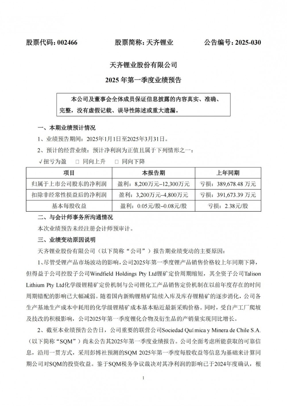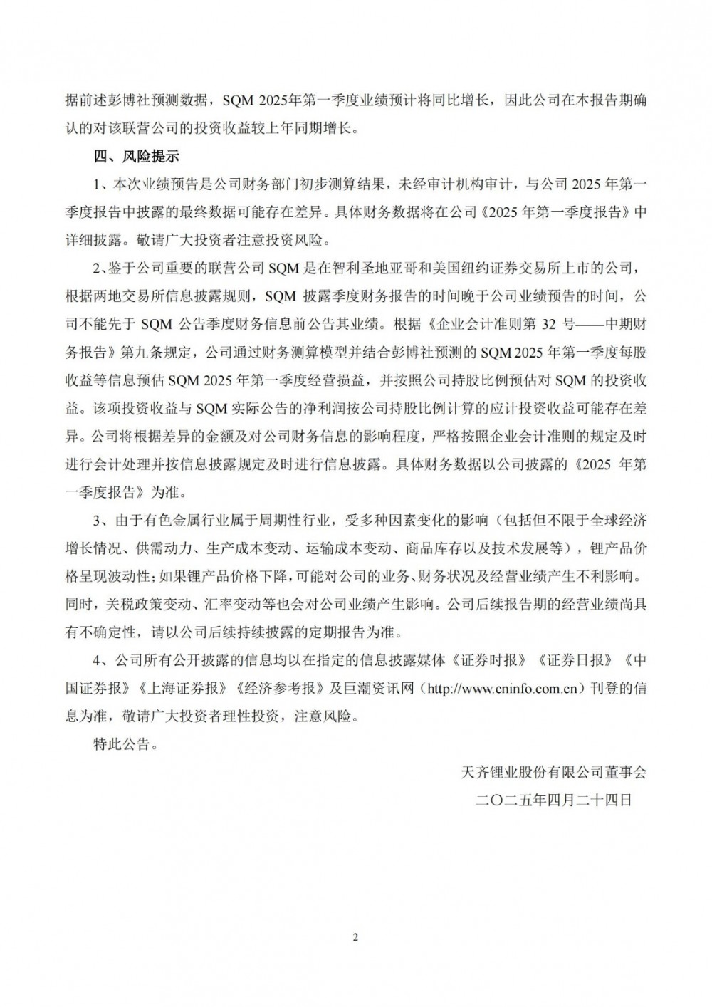 2、截至本业绩预告公告日,公司重要的联营公司Sociedad Química y Minera de Chile S.A.(以下简称“SQM”)尚未公告其2025年第一季度业绩报告。公司全面考虑所能获取的可靠信息,沿用一贯方式,采用彭博社预测的SQM 2025年第一季度每股收益等信息为基础来计算同期公司对SQM的投资收益。鉴于SQM税务争议裁决对其净利润的影响已于2024年度确认,根据前述彭博社预测数据,SQM 2025年第一季度业绩预计将同比增长,因此公司在本报告期确认的对该联营公司的投资收益较上年同期增长。