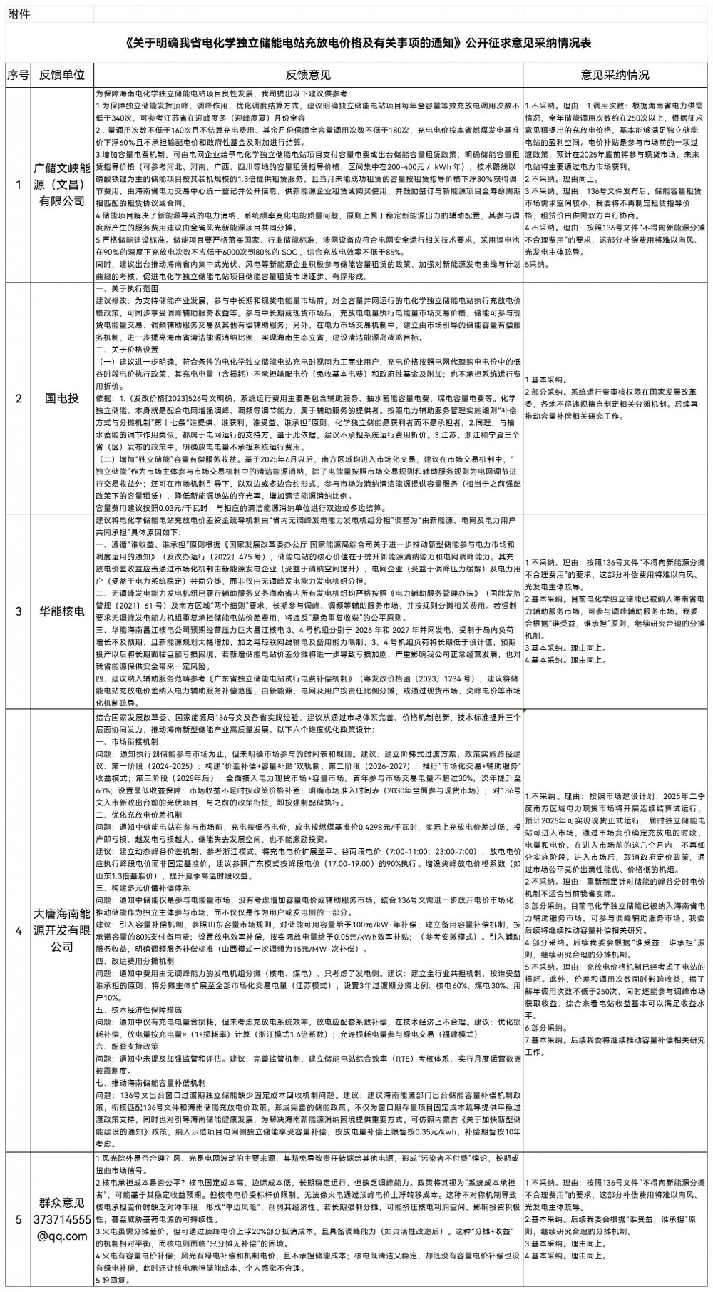 附件:《关于明确我省电化学独立储能电站充放电价格及有关事项的通知》公开征求意见采纳情况表