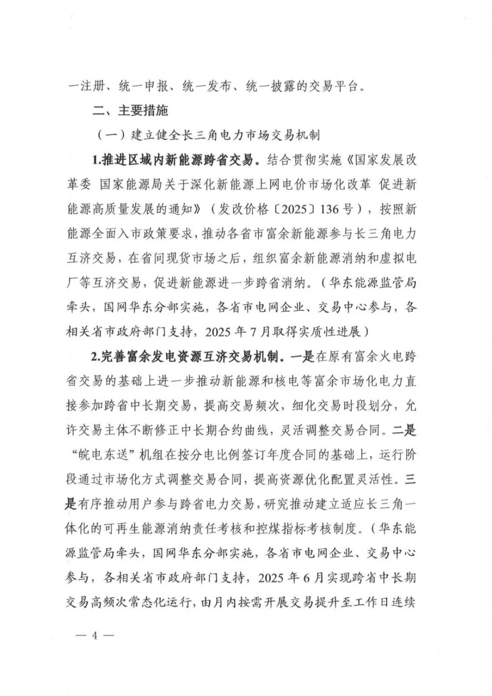 推进区域内新能源跨省交易。结合贯彻实施《国家发展改革委国家能源局关于深化新能源上网电价市场化改革促进新能源高质量发展的通知》(发改价格〔2025]136号),按照新能源全面入市政策要求,推动各省市富余新能源参与长三角电力互济交易,在省间现货市场之后,组织富余新能源消纳和虚拟电厂等互济交易,促进新能源进一步跨省消纳。