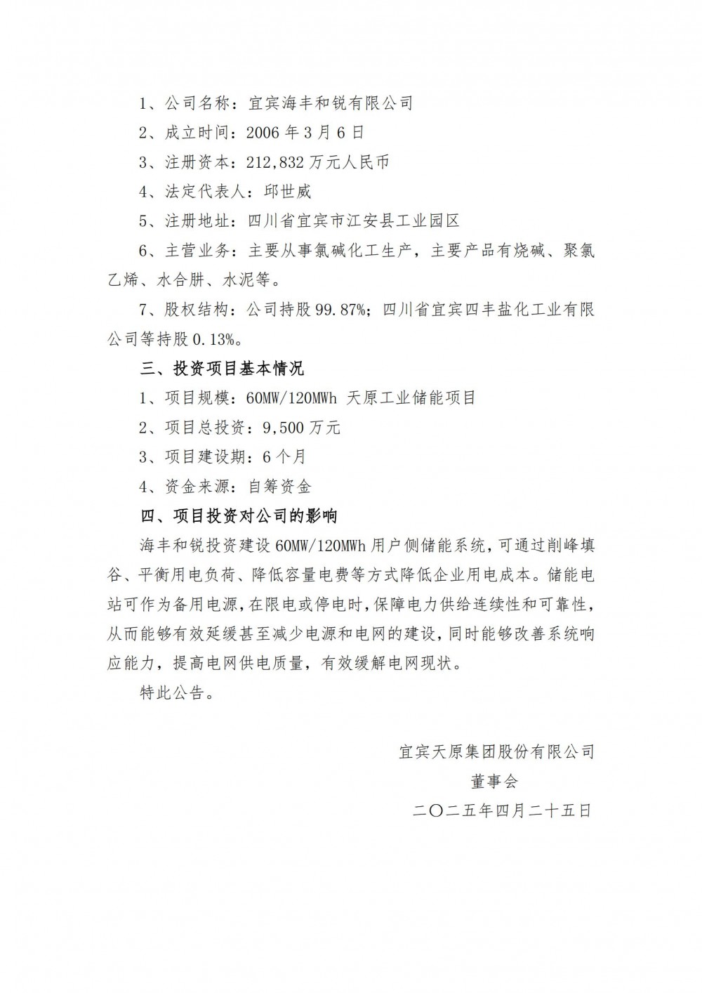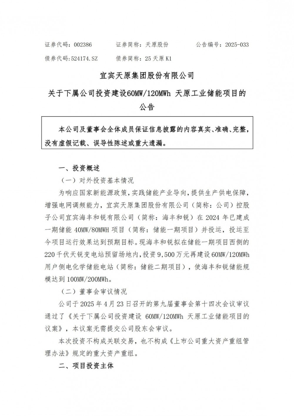 4月24日,天原股份发布公告称,公司控股子公司宜宾海丰和锐有限公司在2024年已建成一期储能40MW/80MWH项目并投运,投运至今项目运行效果达到预期目标。现海丰和锐拟在储能一期项目西侧的220千伏天锐变电站预留场地内,投资9,500万元再建设60MW/120MWh用户侧电化学储能电站,使海丰和锐储能规模达到100MW/200MWh。
