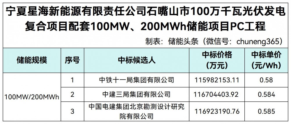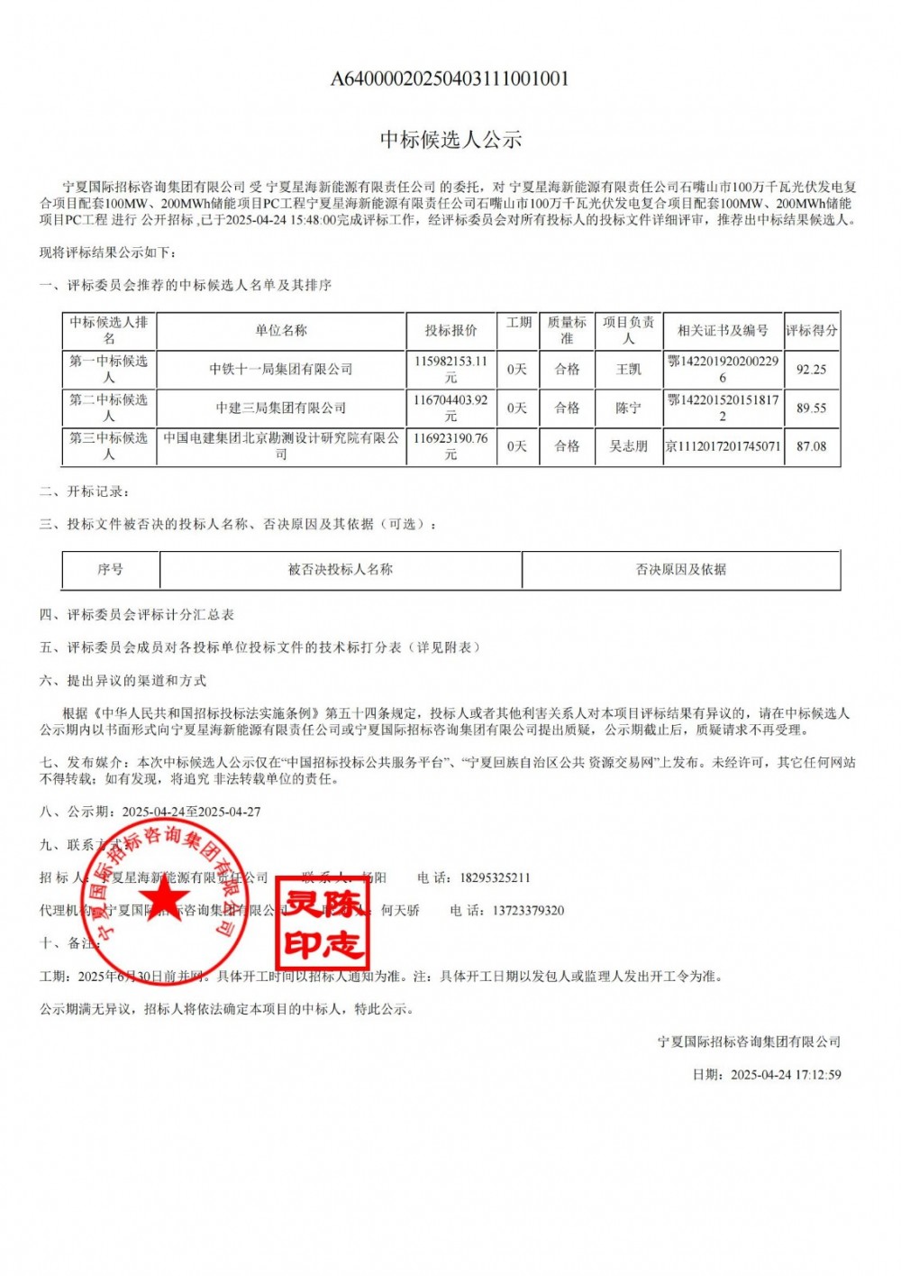 4月25日,宁夏星海新能源有限责任公司石嘴山市100万千瓦光伏发电复合项目配套100MW、200MWh储能项目PC工程中标候选人公示。