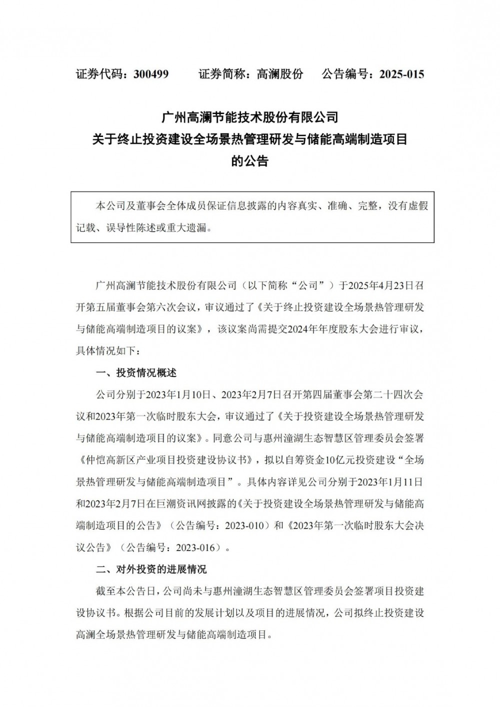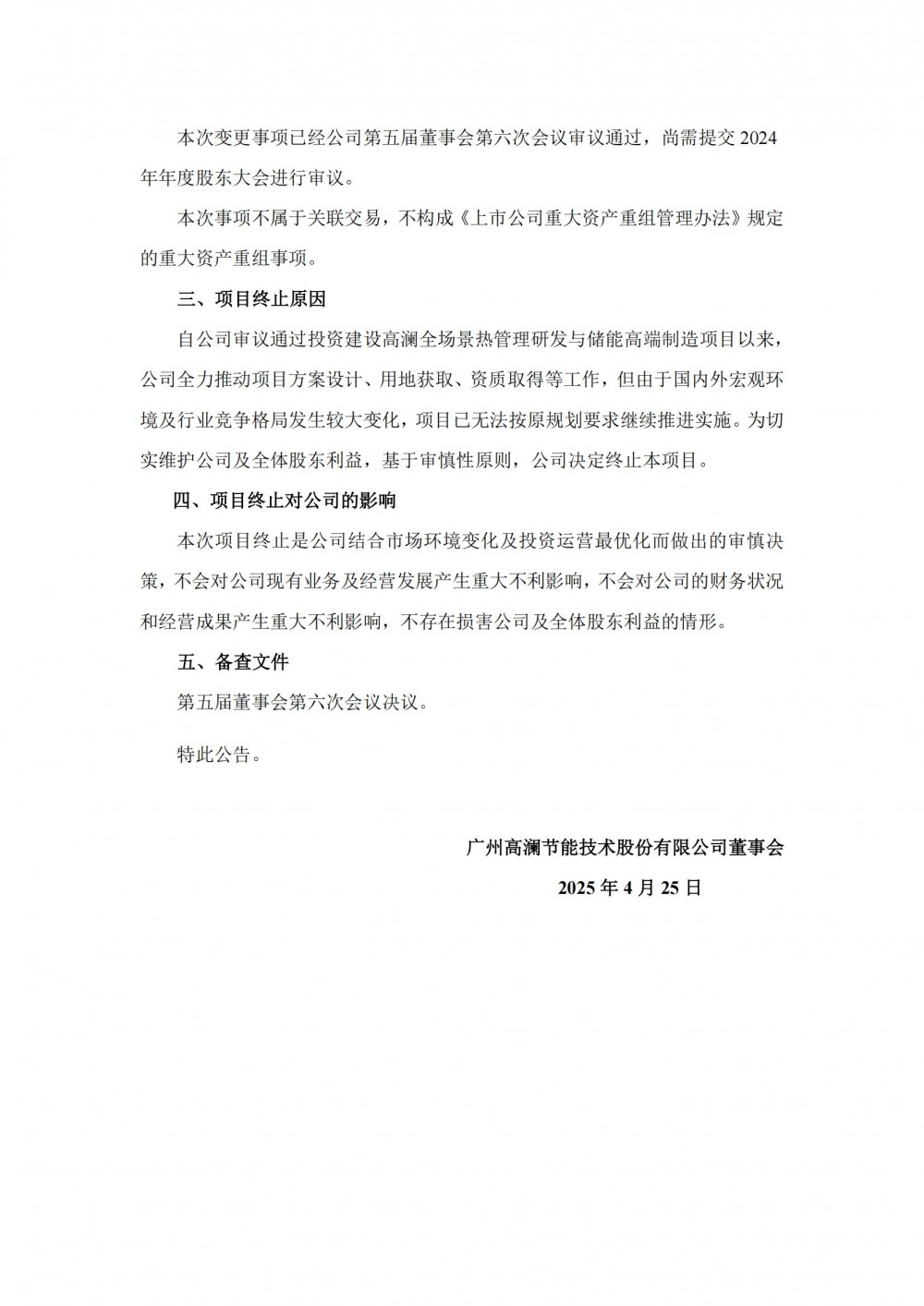 4月25日,高澜股份发布终止投资建设全场景热管理研发与储能高端制造项目的公告。