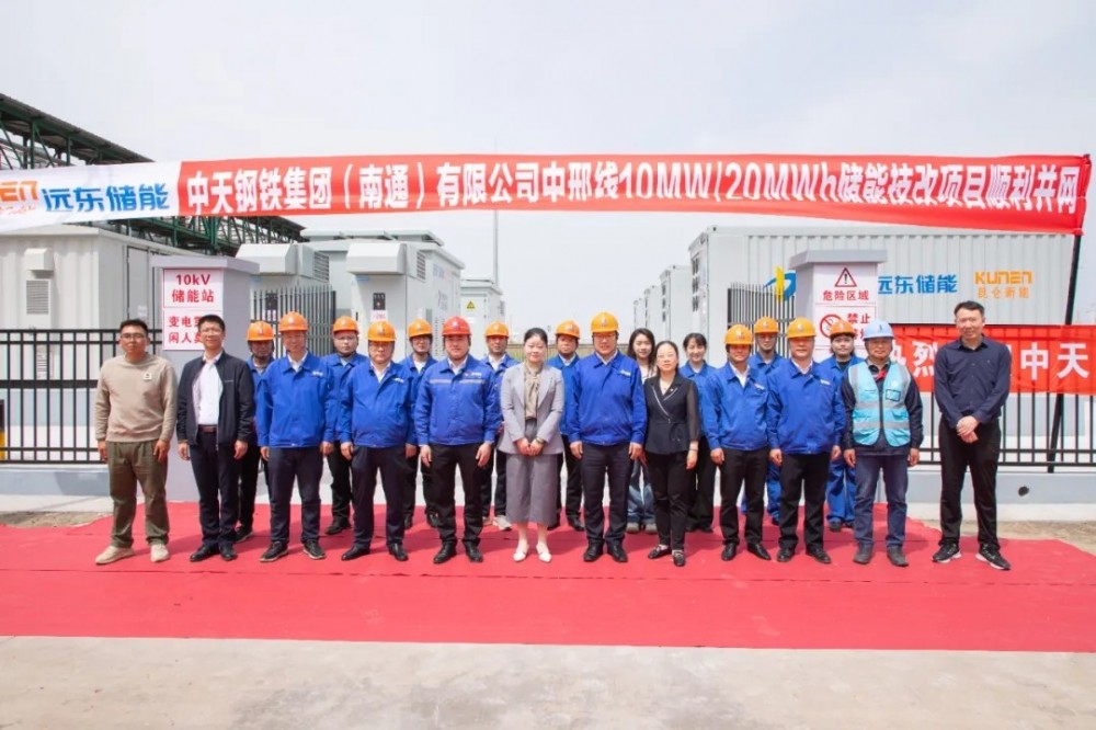 4月24日,由昆仑新能总承包的中天钢铁集团(南通)有限公司(简称:南通中天钢铁)10MW/20MWh储能电站项目并网仪式在中天钢铁南通园区内举行。中天钢铁(南通)有限公司常务副总经理张俊杰,中天钢铁(南通)有限公司副总经理、能控中心分管领导臧雪松,能控中心主任方神州;远东股份资深合伙人、客户官田旭,远东股份高级合伙人、高级客户经理程婷,交付经理吴伦臻;昆仑新能执行总裁周玲霞、总工程师宋正华等领导出席并网仪式。