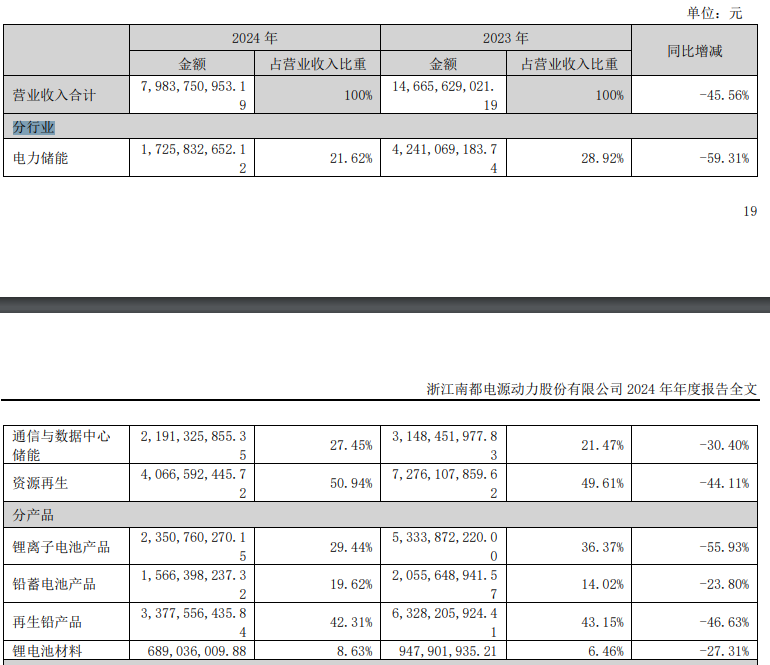 分行业看:电力储能实现营收17.26亿元,同比下降59.31%;通信与数据中心储能实现营收21.91亿元,同比下降30.40%;资源再生实现营收40.67亿元,同比下降40.11%。