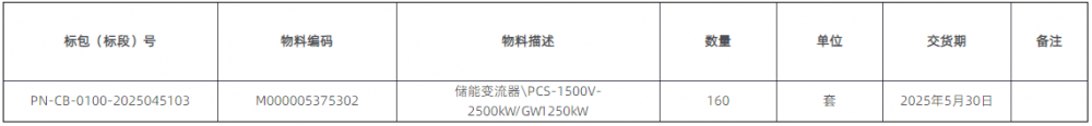 中车四方所拟采购PCS-1500V-2500kW/GW1250kW储能变流器160套,交货期为2025年5月30日。