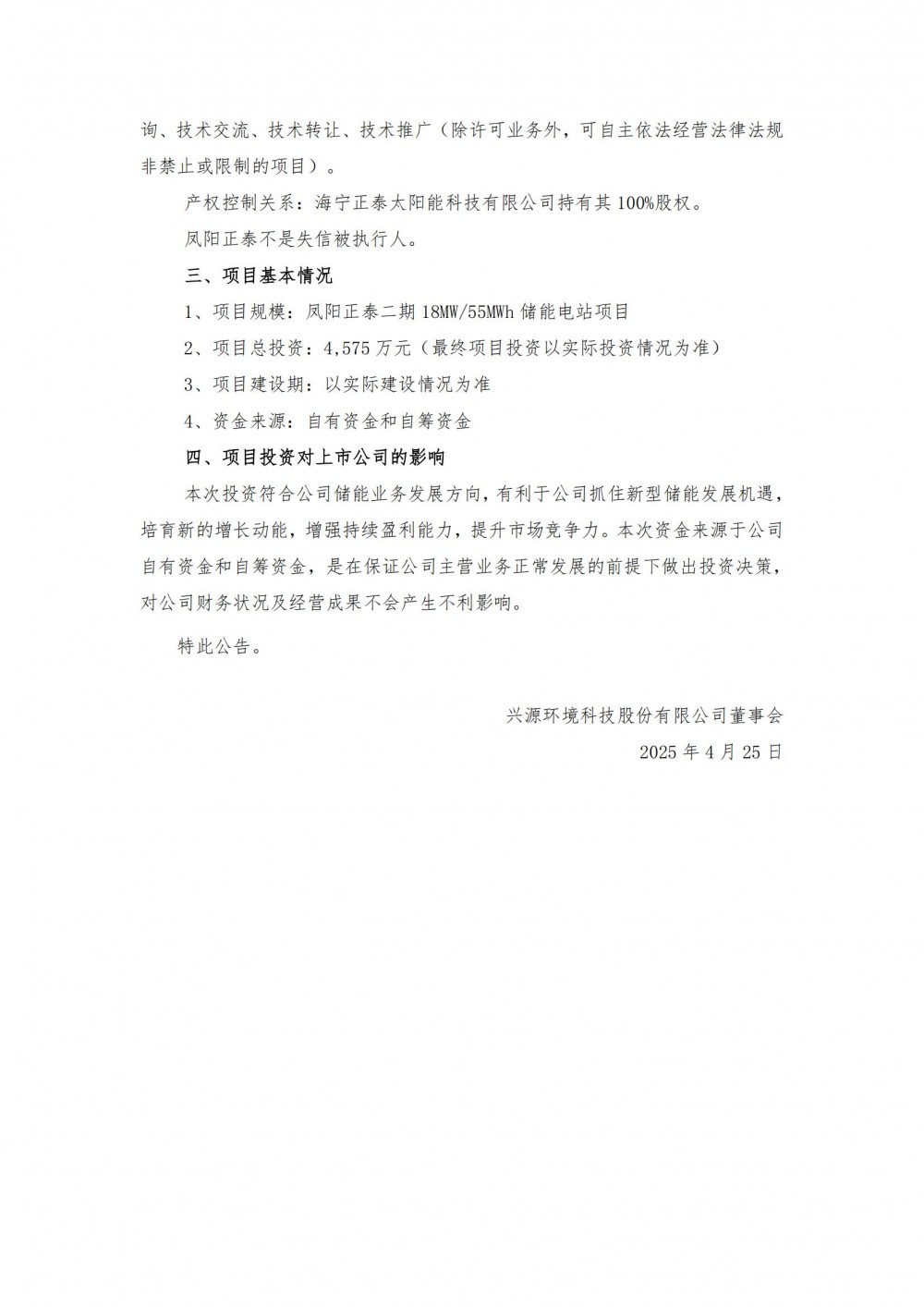 4月27日,兴源环境发布公告称,为加强优质资产储备,加快储能业务布局,公司全资子公司滁州嘉储科技有限公司拟与凤阳正泰太阳能科技有限公司签订建设规模为18MW/55MWh的二期储能电站项目。滁州嘉储负责储能电站项目的投资、建设,项目计划投资额为4,575万元。
