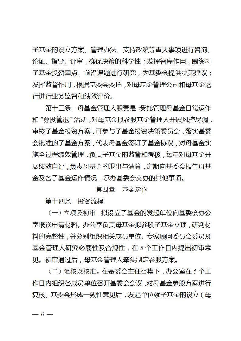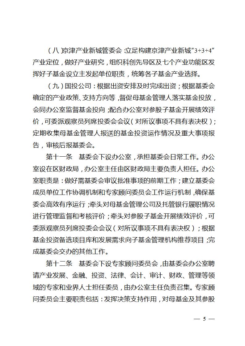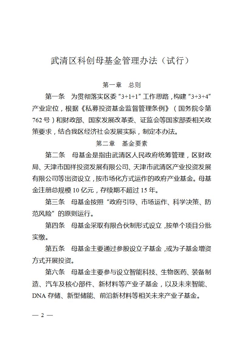 文件指出,母基金是指由武清区人民政府统筹管理,区财政局、天津市国祥投资发展有限公司、天津市武清区产业投资发展有限公司等出资设立,按市场化方式运作的政府产业基金。母基金注册总规模10亿元,存续期不超过15年。