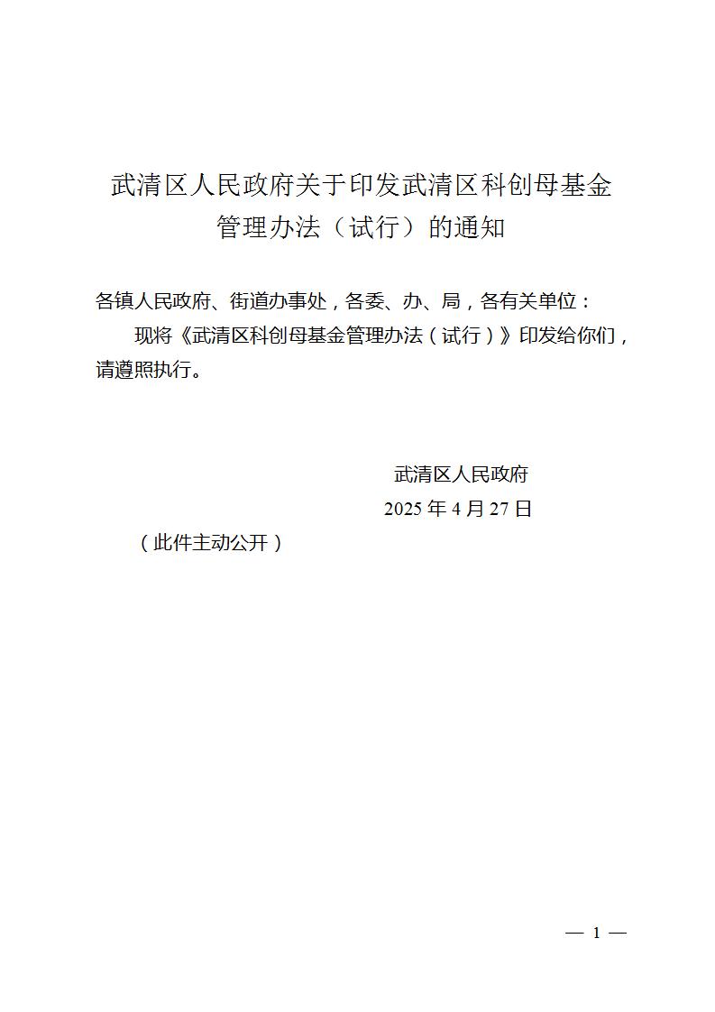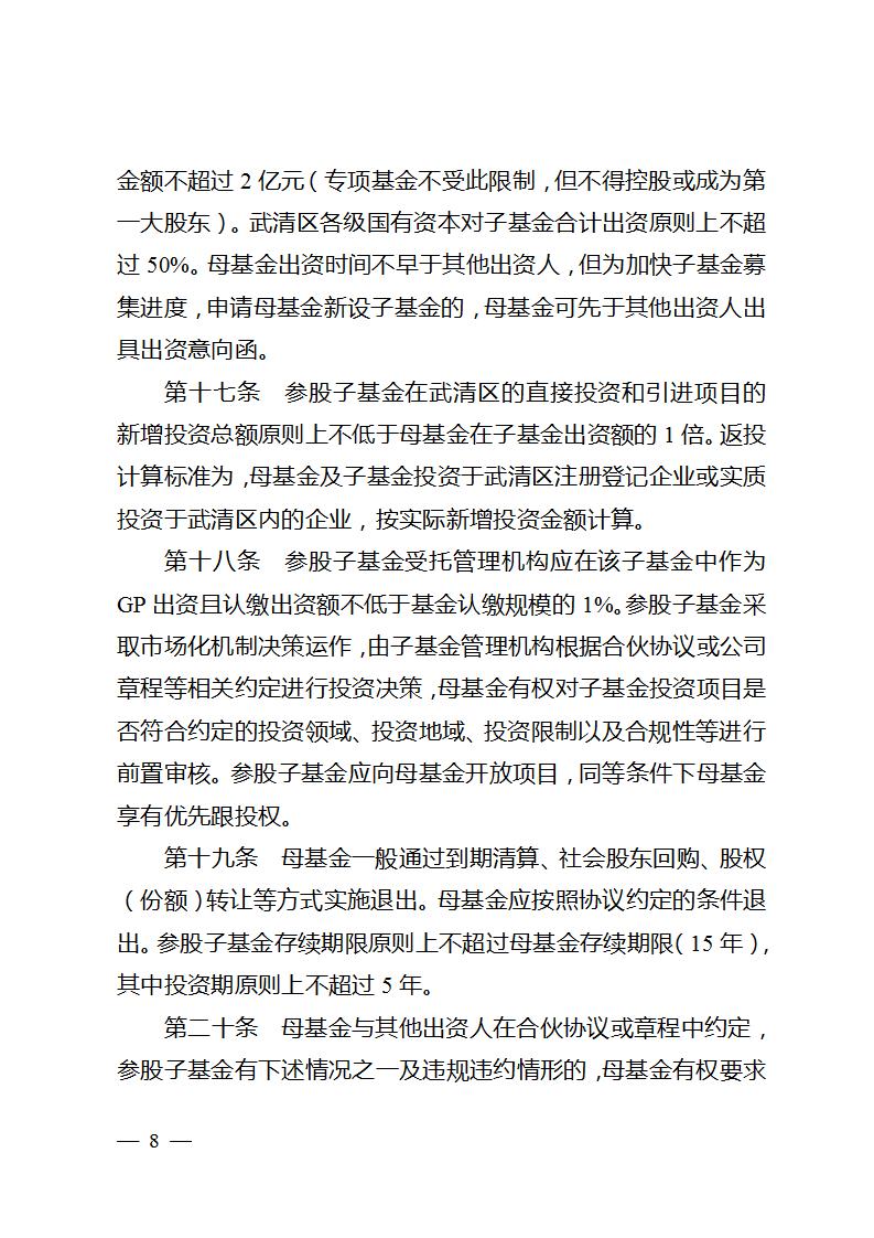 4月27日,天津市武清区人民政府发布关于印发武清区科创母基金管理办法(试行)的通知。