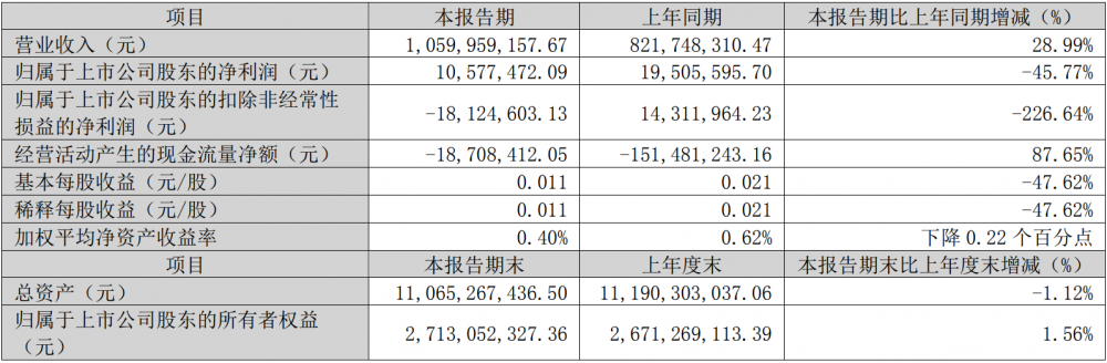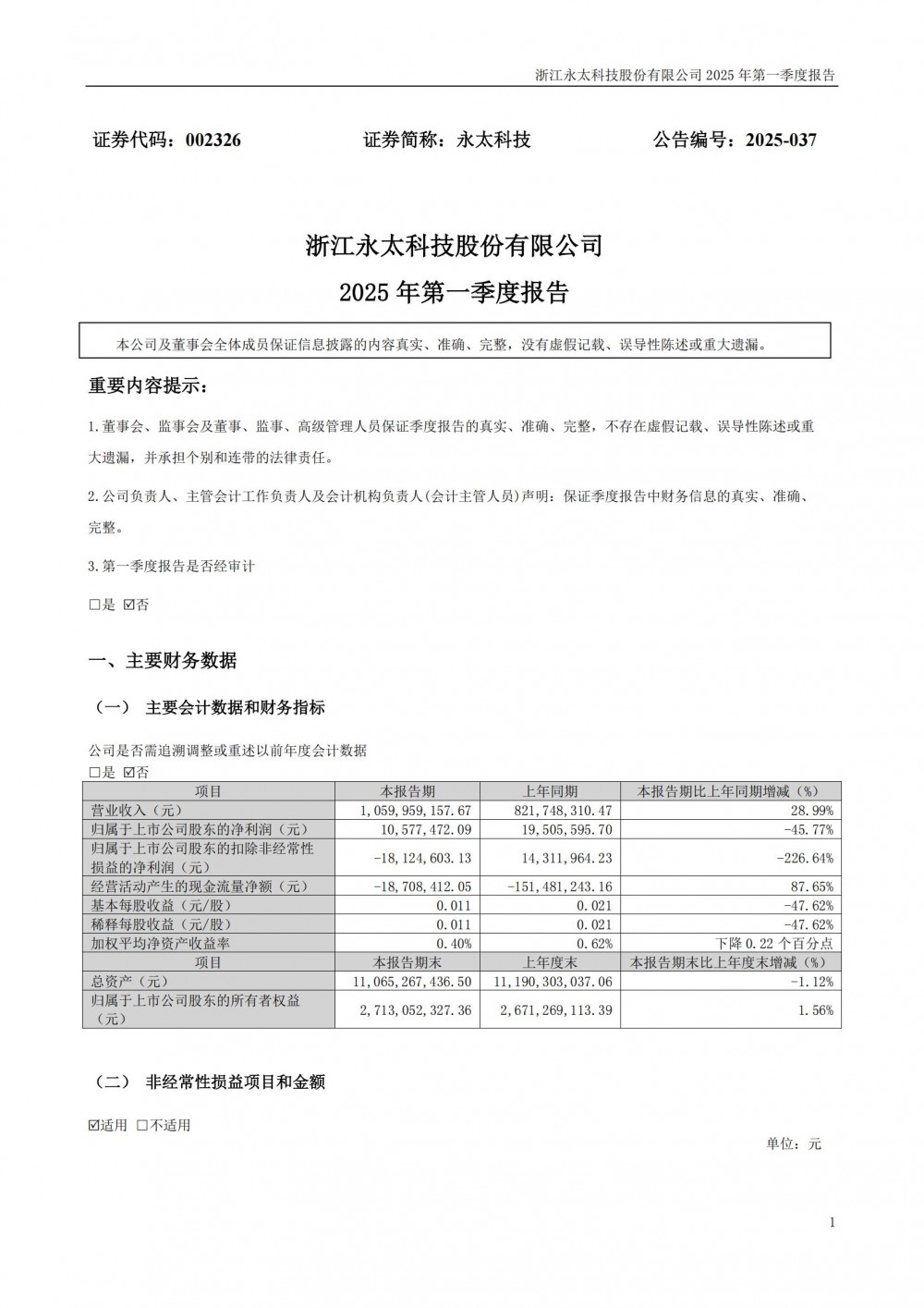 财报数据显示,一季度,永太科技实现营收10.6亿元,同比增长28.99%;归属上市公司股东净利润1057.75万元,较去年同期下降45.77%。