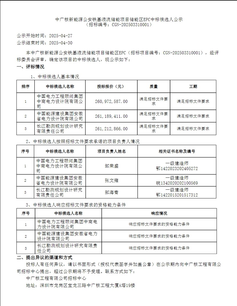 4月27日,中广核新能源公安铁基液流储能项目储能区EPC中标候选人公示。