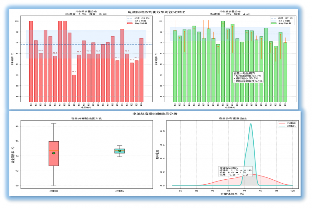 在电池系统的全生命周期中,单体电芯的“健康差异”如同多米诺骨牌,可能引发连锁式效能衰减。弘正储能采用介入式主动均衡,实现对容量、内阻、温度离散度的三维协同优化,通过实时监测电芯微观参数,系统以能量转移方式补偿差异,使储能系统放电深度提升 2%左右。