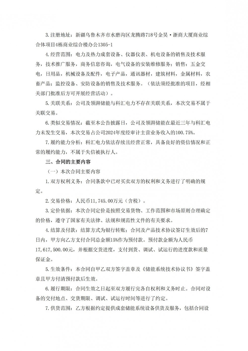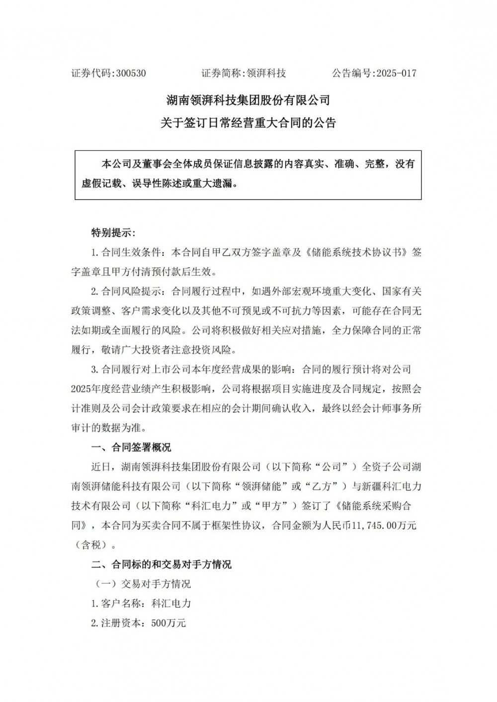 4月28日,领湃科技发布公告称,公司全资子公司湖南领湃储能科技有限公司与新疆科汇电力技术有限公司签订了《储能系统采购合同》,本合同为买卖合同不属于框架性协议,合同金额为人民币11,745.00万元(含税)。