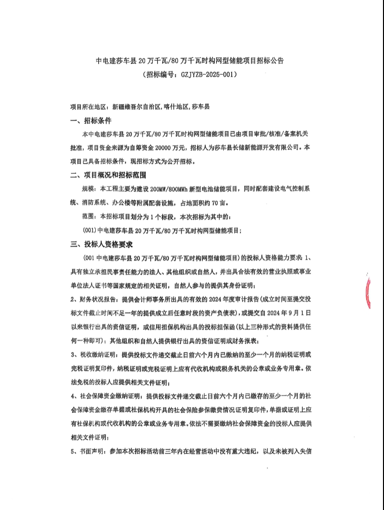 4月28日,中电建莎车县20万千瓦/80万千瓦时构网型储能项目招标公告发布,项目资金来源为自筹资金20000万元,招标人为莎车县长储新能源开发有限公司。