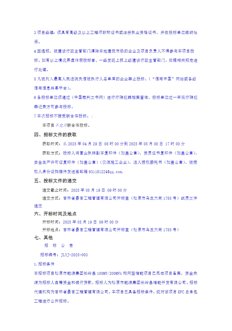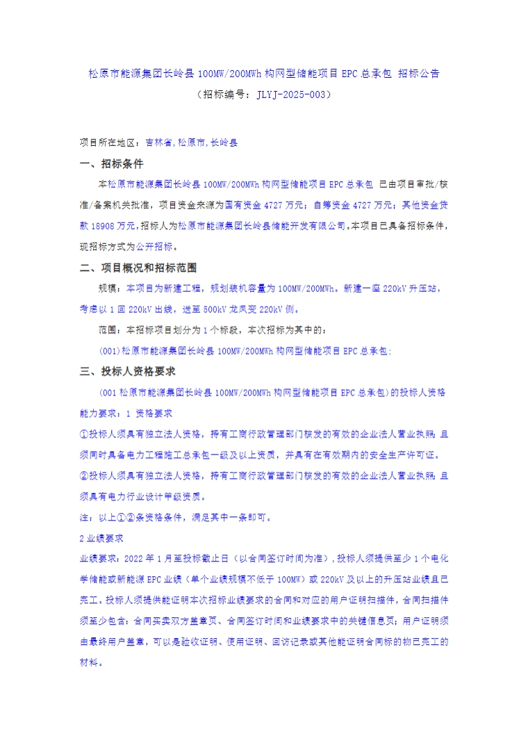 4月28日,松原市能源集团长岭县100MW/200MWh构网型储能项目EPC总承包招标公告发布,项目资金来源为国有资金4727万元;自筹资金4727万元;其他资金贷款18908万元,招标人为松原市能源集团长岭县储能开发有限公司。