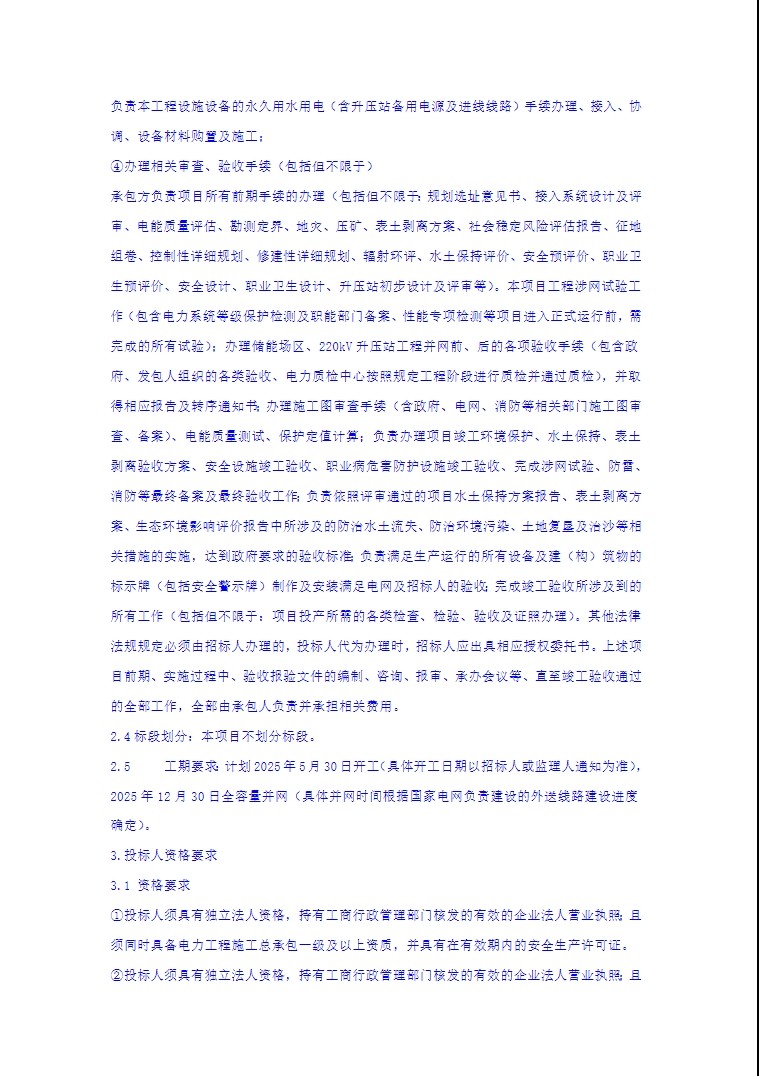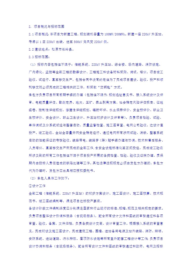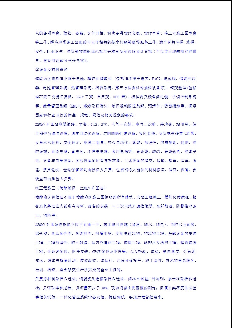 招标内容包括但不限于:储能系统、220kV升压站、综合楼、场内道路、消防设施厂内绿化、监控等全部工程的勘察设计、工程施工和设备材料采购、调试、培训,项目竣工验收、试运行、直至移交生产,包括合同中没有约定但为了完成项目建设、验收、投产和顺利移交而必须完成的工程相关的工作,即采取“交钥匙”方式。
