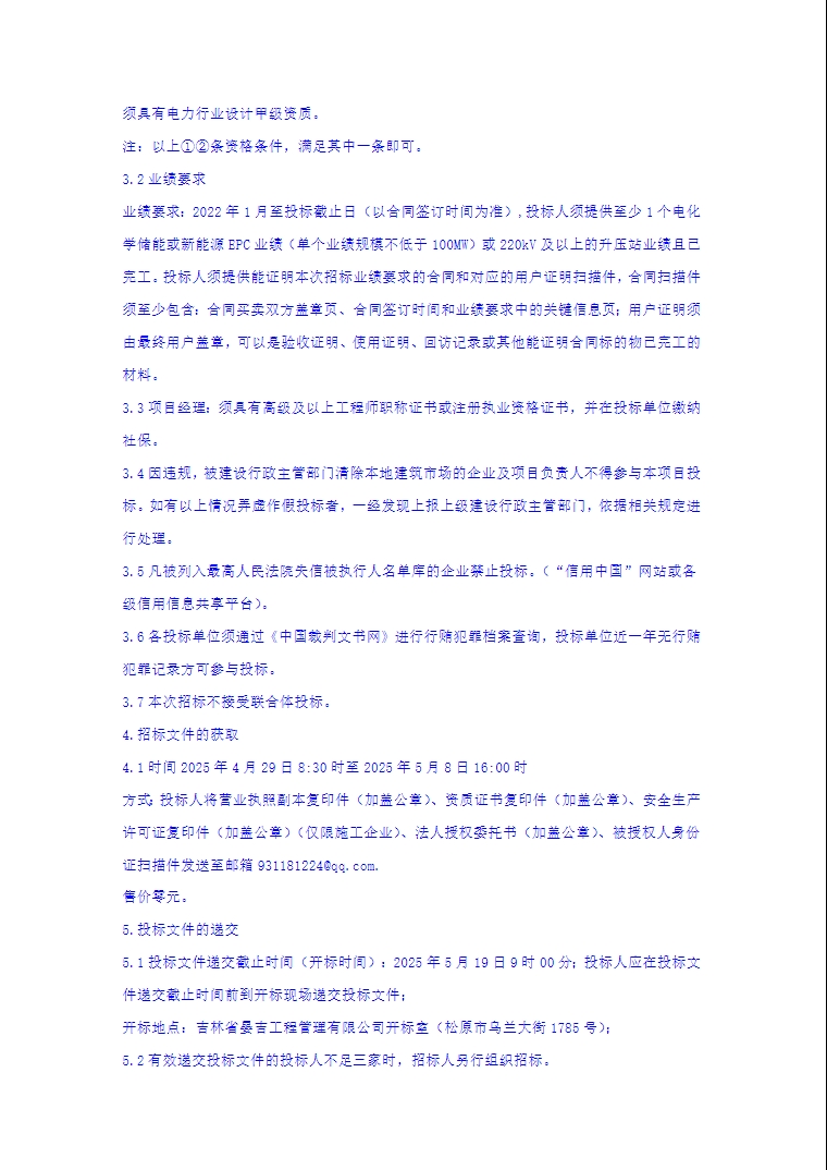 2022年1月至投标截止日(以合同签订时间为准),投标人须提供至少1个电化学储能或新能源 EPC业绩(单个业绩规模不低于100MW)或220kV及以上的升压站业绩且己完工。