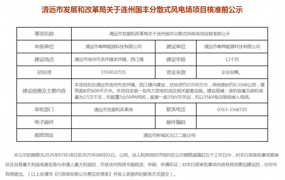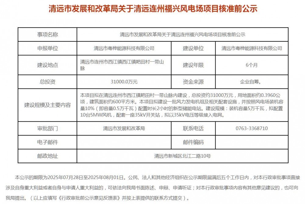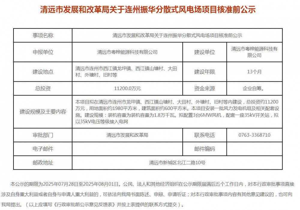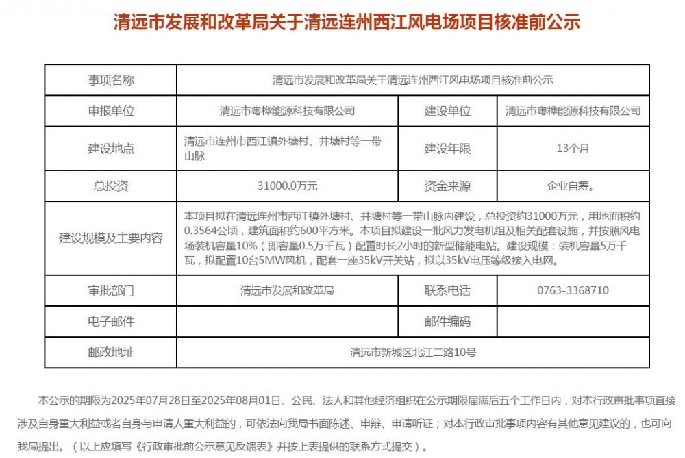 近日,广东省清远市5个风电项目核准前公示。