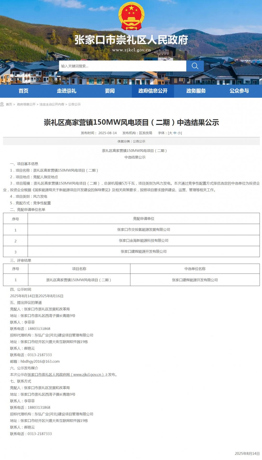 崇礼区高家营镇150MW风电项目(二期)中选单位为张家口建辉能源开发有限公司。