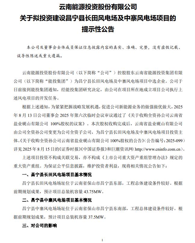 8月15日,云南能投发布关于拟投资建设昌宁县长田风电场及中寨风电场项目的提示性公告。
