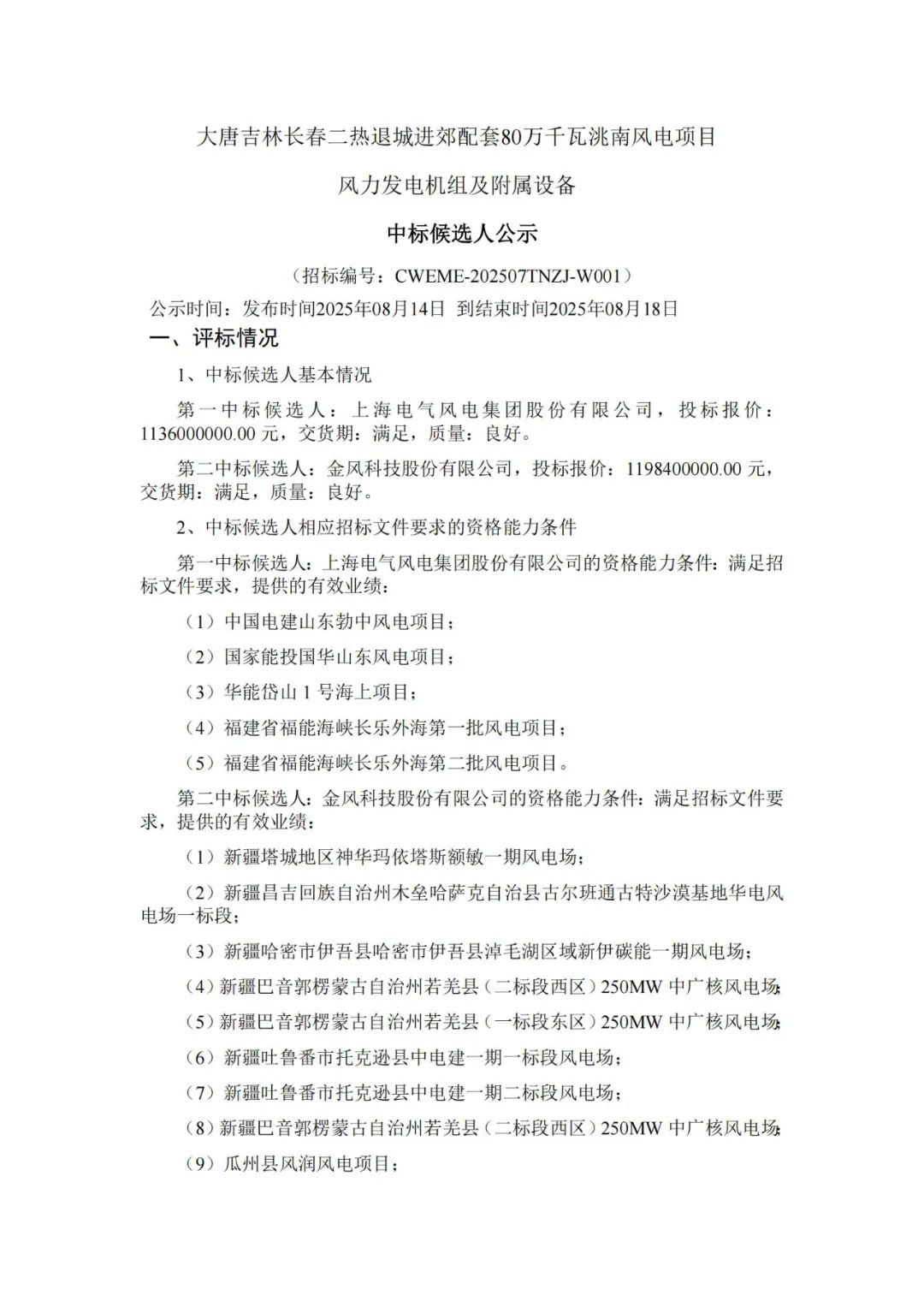 根据公示,远景能源、运达股份、电气风电作为第一中标候选人预中标。