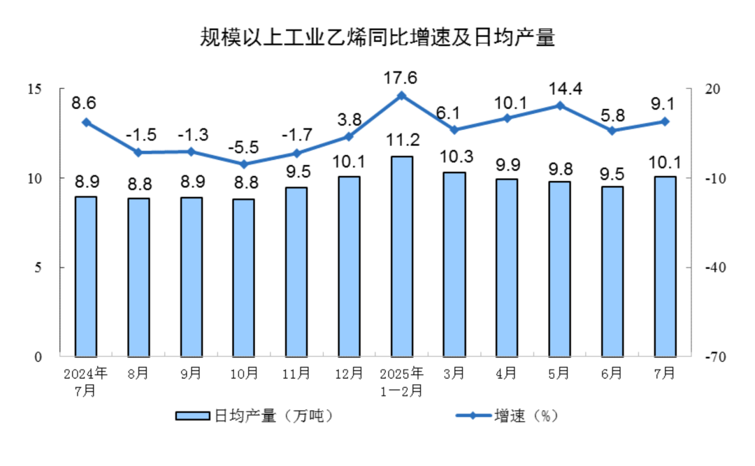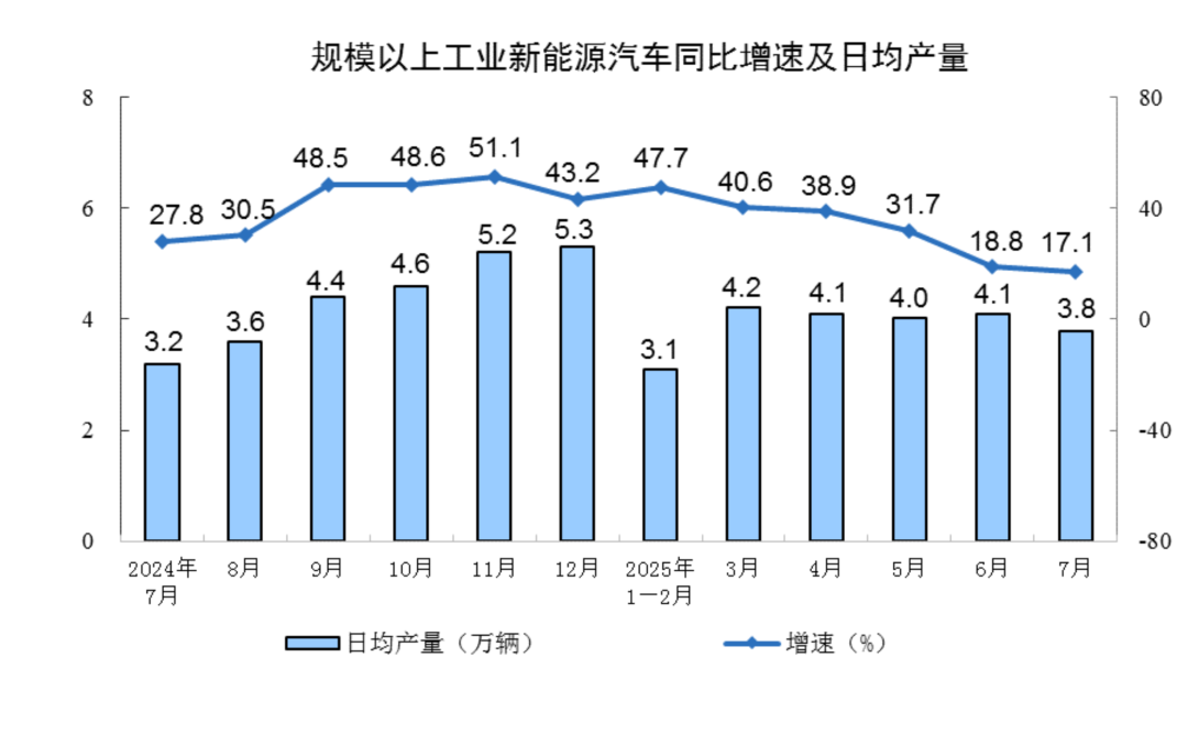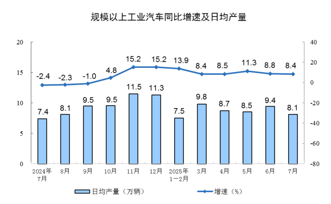 分产品看,7月份,规模以上工业623种产品中有335种产品产量同比增长。其中,钢材12295万吨,同比增长6.4%;水泥14557万吨,下降5.6%;十种有色金属681万吨,增长2.2%;乙烯312万吨,增长9.1%;汽车251.0万辆,增长8.4%,其中新能源汽车117.6万辆,增长17.1%;发电量9267亿千瓦时,增长3.1%;原油加工量6306万吨,增长8.9%。