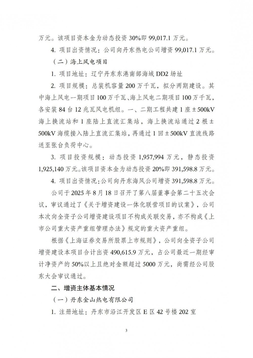 公告显示,华电辽宁能源发展股份有限公司拟向全资子公司丹东金山热电有限公司(简称丹东热电公司)和华电(丹东)海上风电有限公司(简称丹东海风公司)增资建设热电联产与海上风电一体化联营项目。