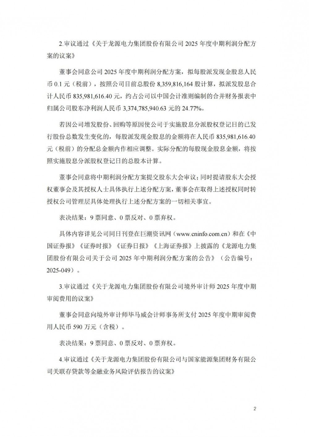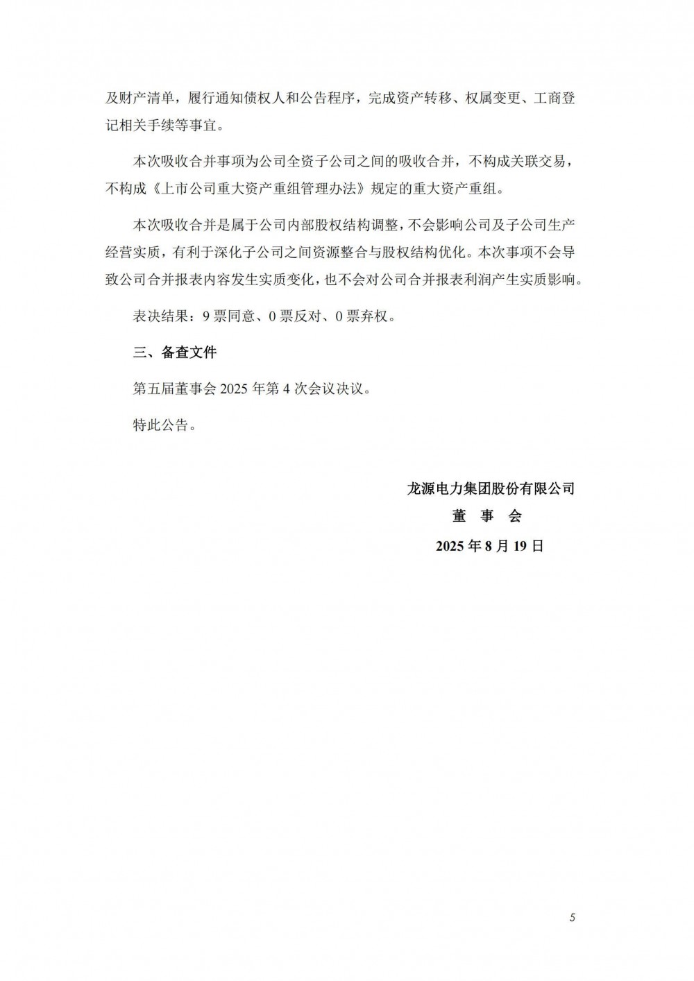 8月20日,龙源电力集团股份有限公司第五届董事会2025年第 4 次会议决议公告发布。