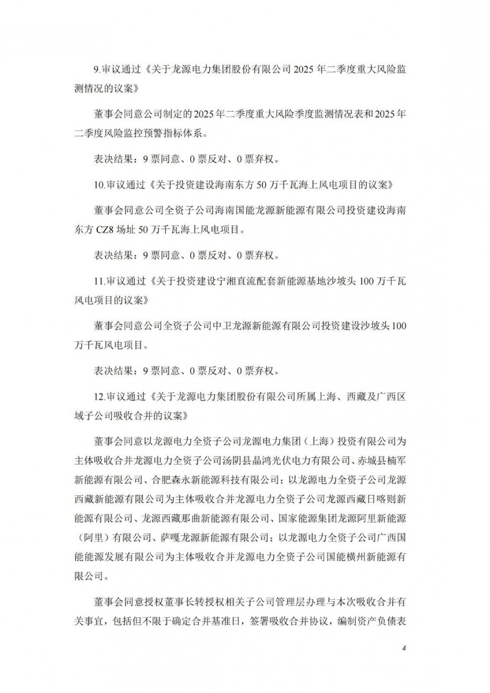 董事会同意龙源电力全资子公司海南国能龙源新能源有限公司投资建设海南东方CZ8场址50万千瓦海上风电项目。董事会同意龙源电力全资子公司中卫龙源新能源有限公司投资建设沙坡头100万千瓦风电项目。
