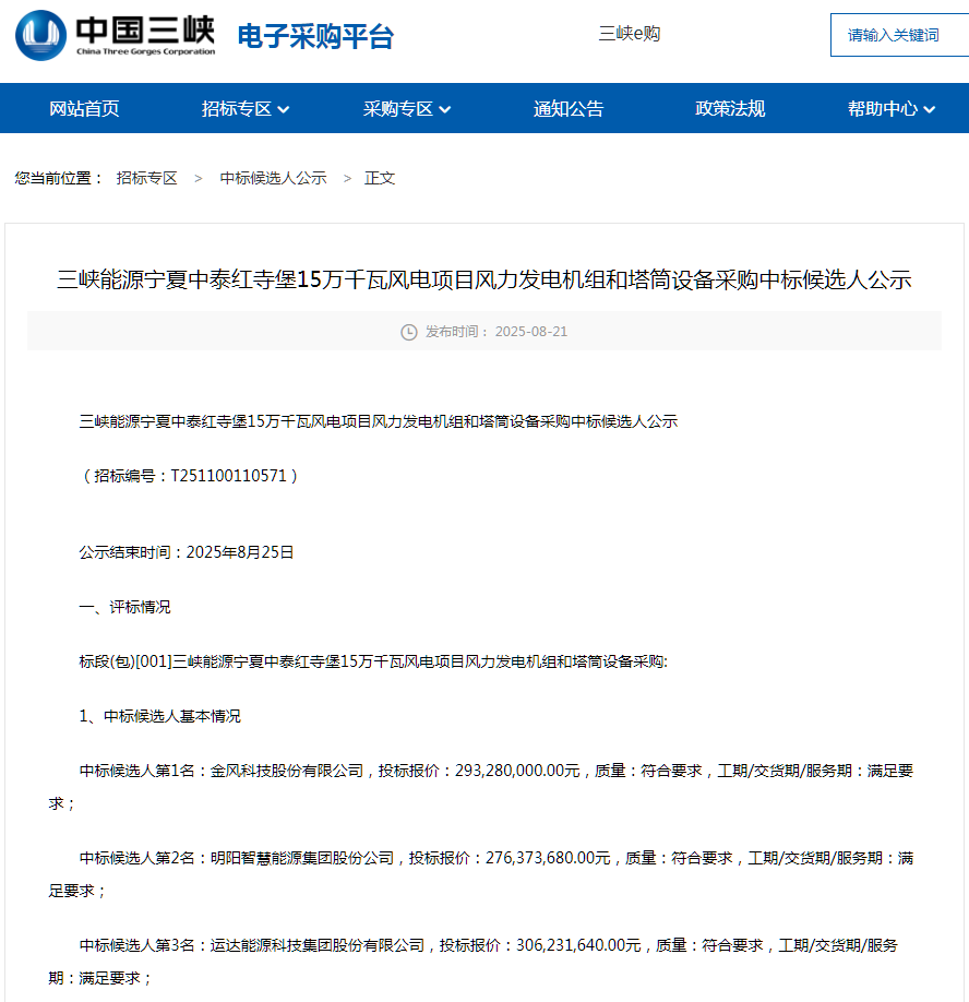 根据公示,运达股份、明阳智能、金风科技作为第一中标候选人预中标。